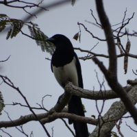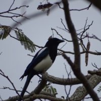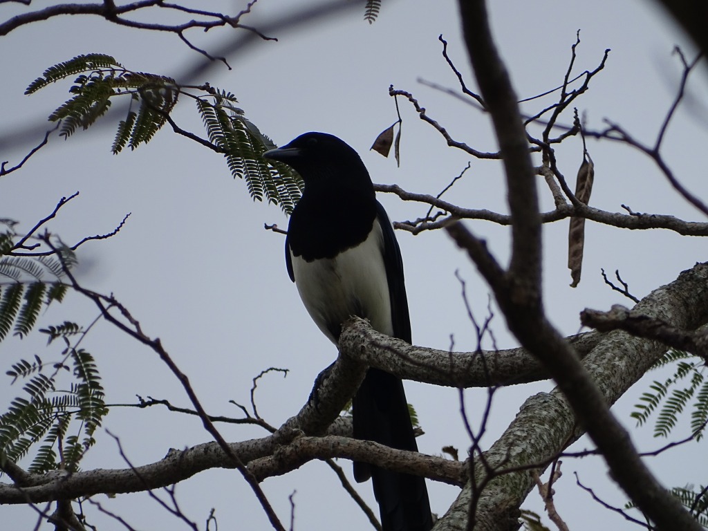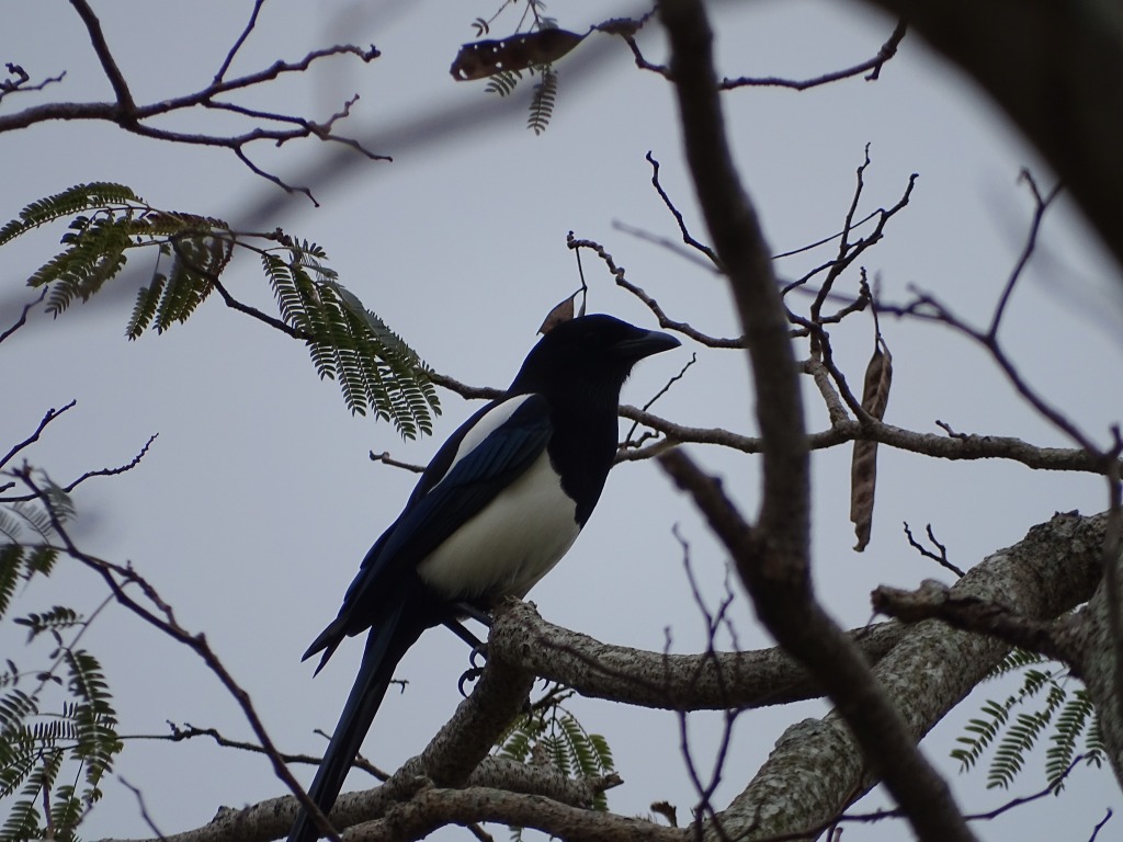 カササギです。江津湖ではあまり見かけません。九州北部から南下して勢力を拡大していると聞いたことがあります。数年前に見かけたときに江津湖でも見かける頻度が多くなるかもと考えていましたが、なかなか増えません。まだまだ江津湖では珍しい野鳥です。