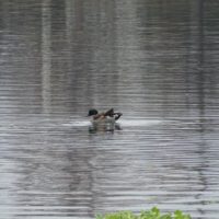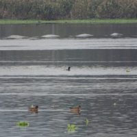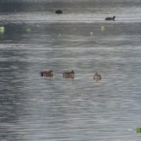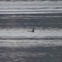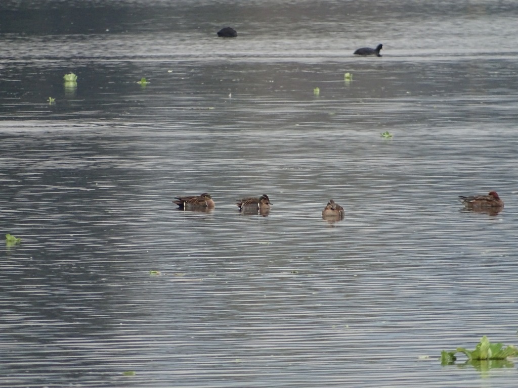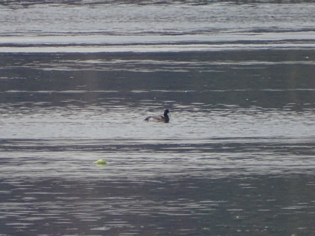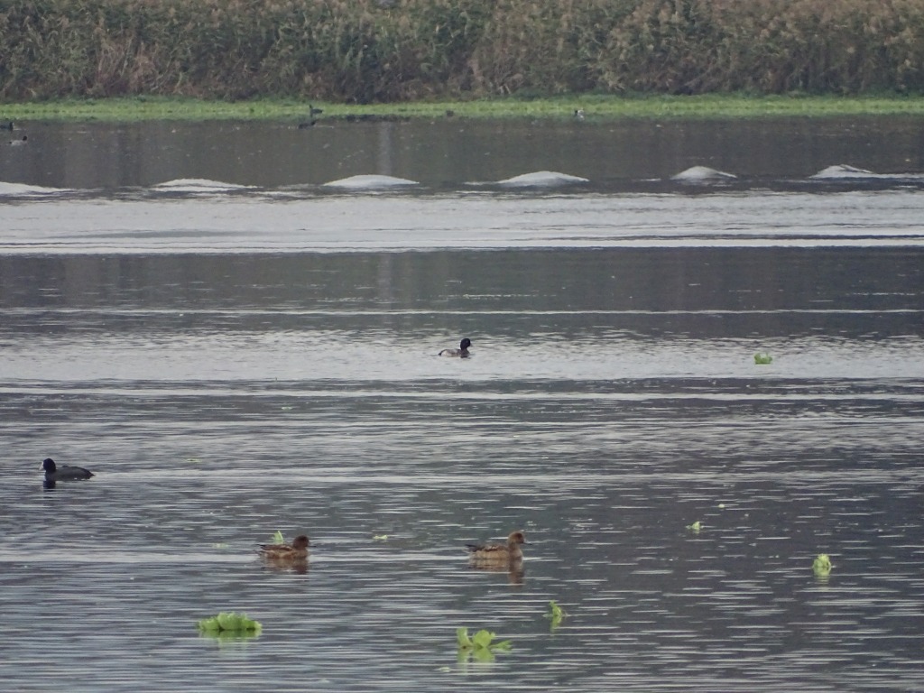 スズガモです。距離が非常に遠く、スズガモと断定するのは難しいですが、キンクロハジロではないようですので、消去法でスズガモでしょうか…。スズガモ自体、江津湖ではこれまであまり見かけていませんでしたが、今季はときどき江津湖に入ってきているようです。江津湖では非常に珍しいですが、時々見かけるようになると、珍しさも薄らいでいきます。