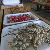 ナンキンハゼの白い実やクロガネモチの赤い実、センダンの黄色い実、モミジバフウのとげとげの実などなど。またヒイラギモクセイの葉、ヨシの穂、ヘクソカズラの実なども観察しました。