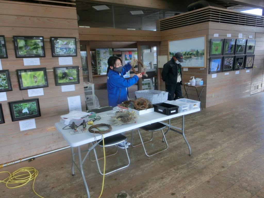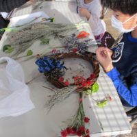外で観察した後は、いよいよリースづくりです。前もって準備していた土台に材料を飾り付けていきます。飾り付ける材料も事前に乾燥させるなどして準備しました。