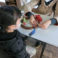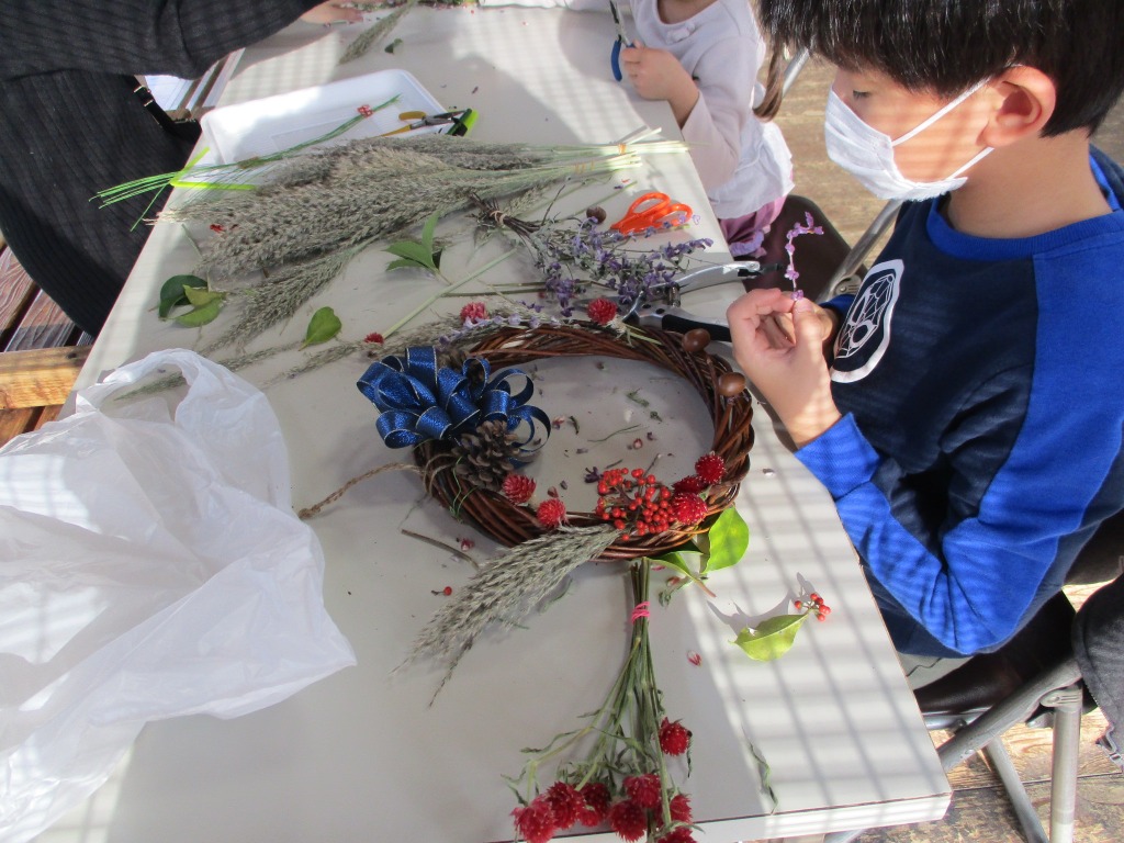 今日はわくわくえづっ子塾「Xmasかざりをつくろう!」を実施しました。主に園内で見れる木の実や葉っぱ、花などを使ったクリスマスリースをつくります。