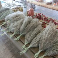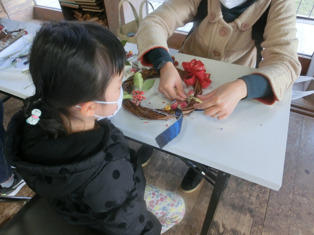 ヨシの穂や葉っぱを差し込んだり、赤い実や松ぼっくりなどを付けたら、だんだんとリースらしくなってきます。いろいろな個性が出た、子どもらしい楽しいリースづくりです!テープやリボンを巻きつけて完成です!