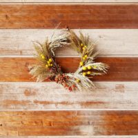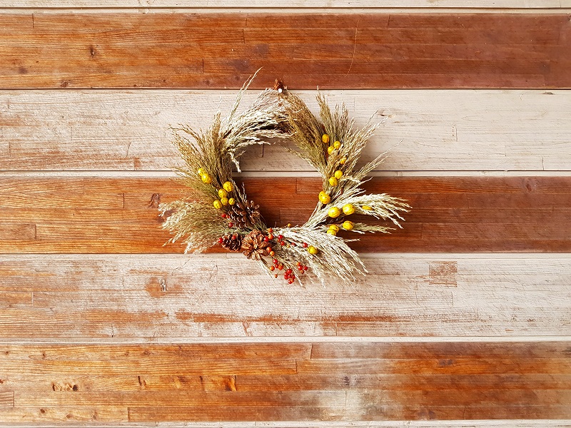 写真のリースの材料はヨシと松ぼっくり、センダン(黄色の実)、ノイバラ(赤い実)です。