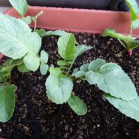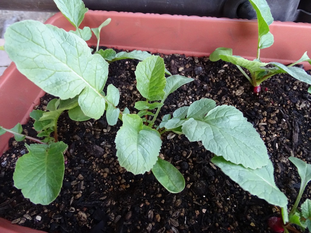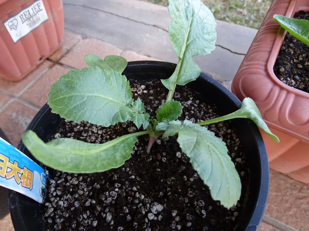 イベントの時に見てもらおうと、(共に小型の)カブとダイコンを鉢に育てていました。