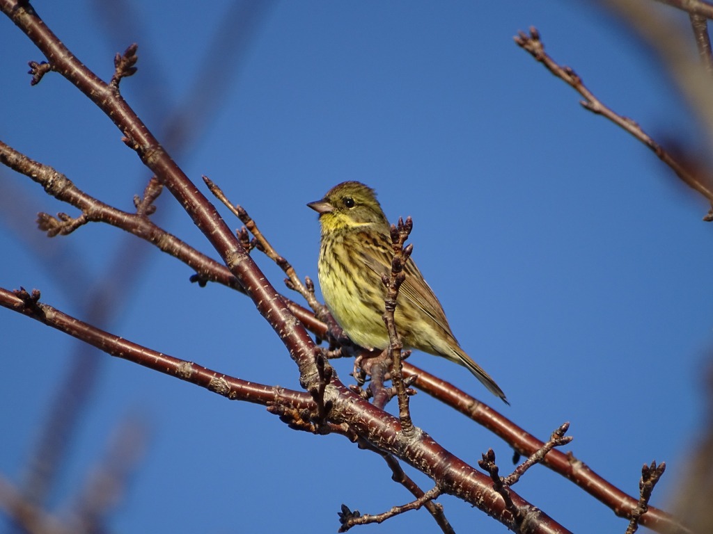 園内でアオジをよく見かけます。といっても、なかなかやぶの中から姿を見せません。やぶの中で「ツッツッ、チッチッ」とよく鳴いています。 ウグイスもよくやぶの中で鳴いていますが、こちらは「チャッチャッチャ」とにごりのある感じです。鳴き声で見分けがつきます。 江津湖では冬鳥となっており、今の時期江津湖全域、ヨシなどのやぶのある場所で観察できます。