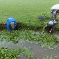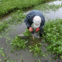 今日はあいにくの雨模様でしたが、広木地区でミズアオイの保全活動を実施しました。今日はミズアオイの間引き作業です。