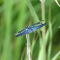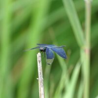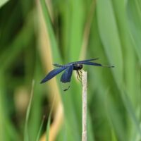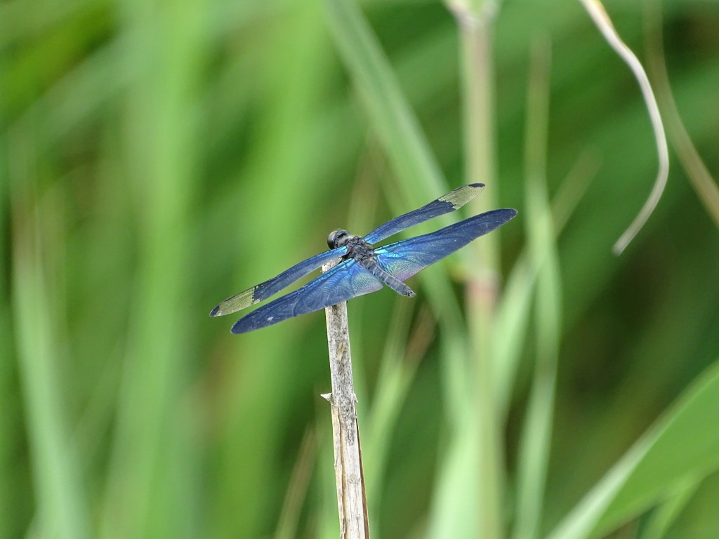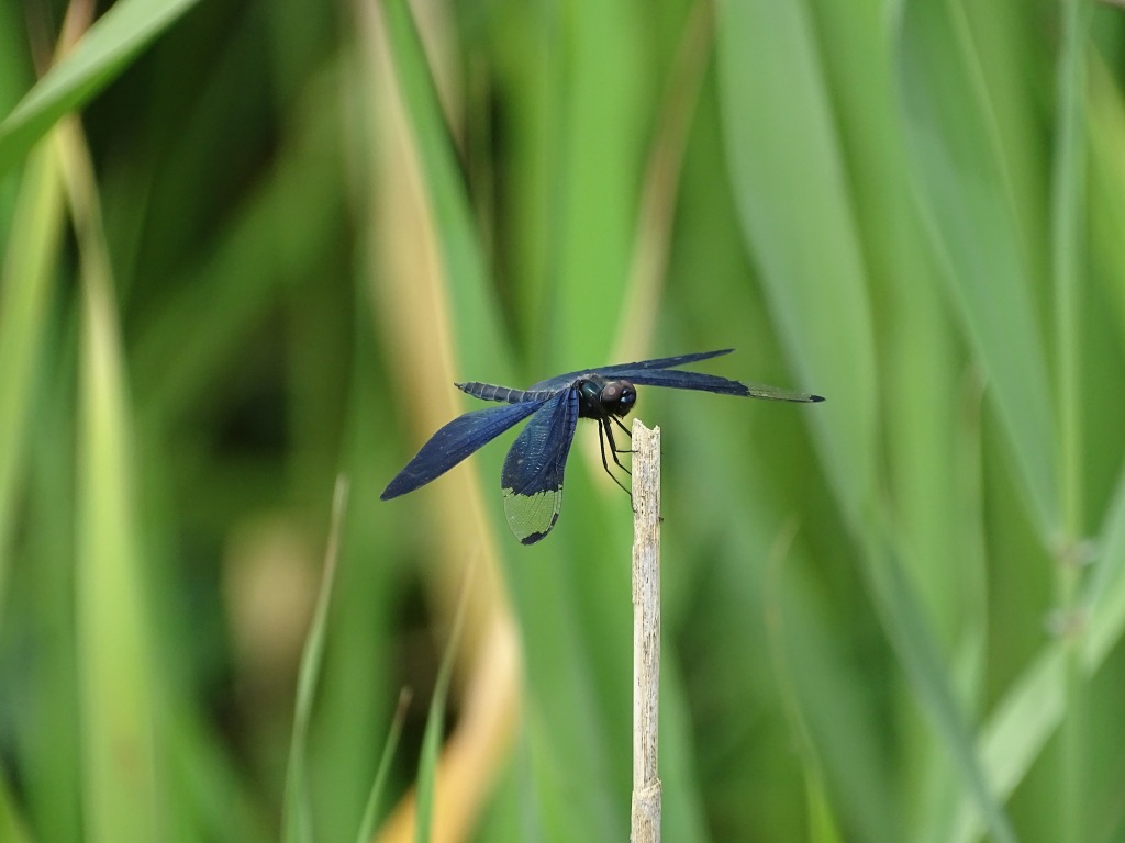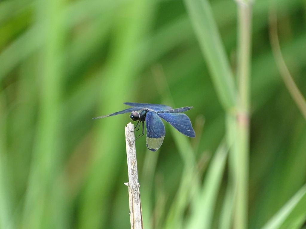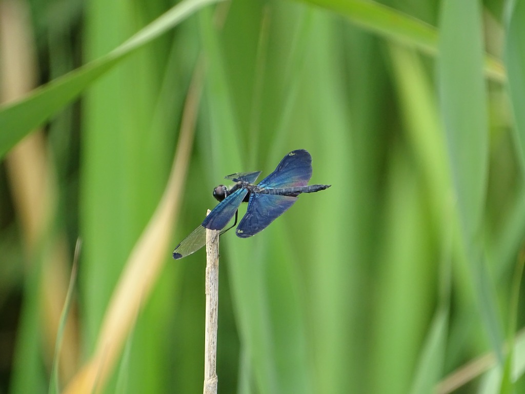 今季はチョウトンボをよく見かけます。黒っぽい翅ですが、光に当たると七色に光っていますね。