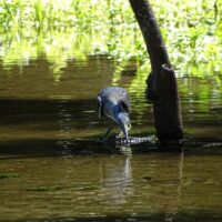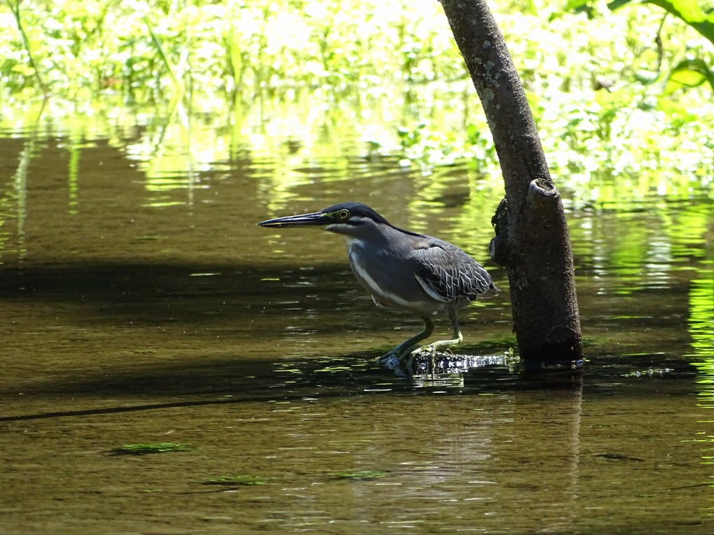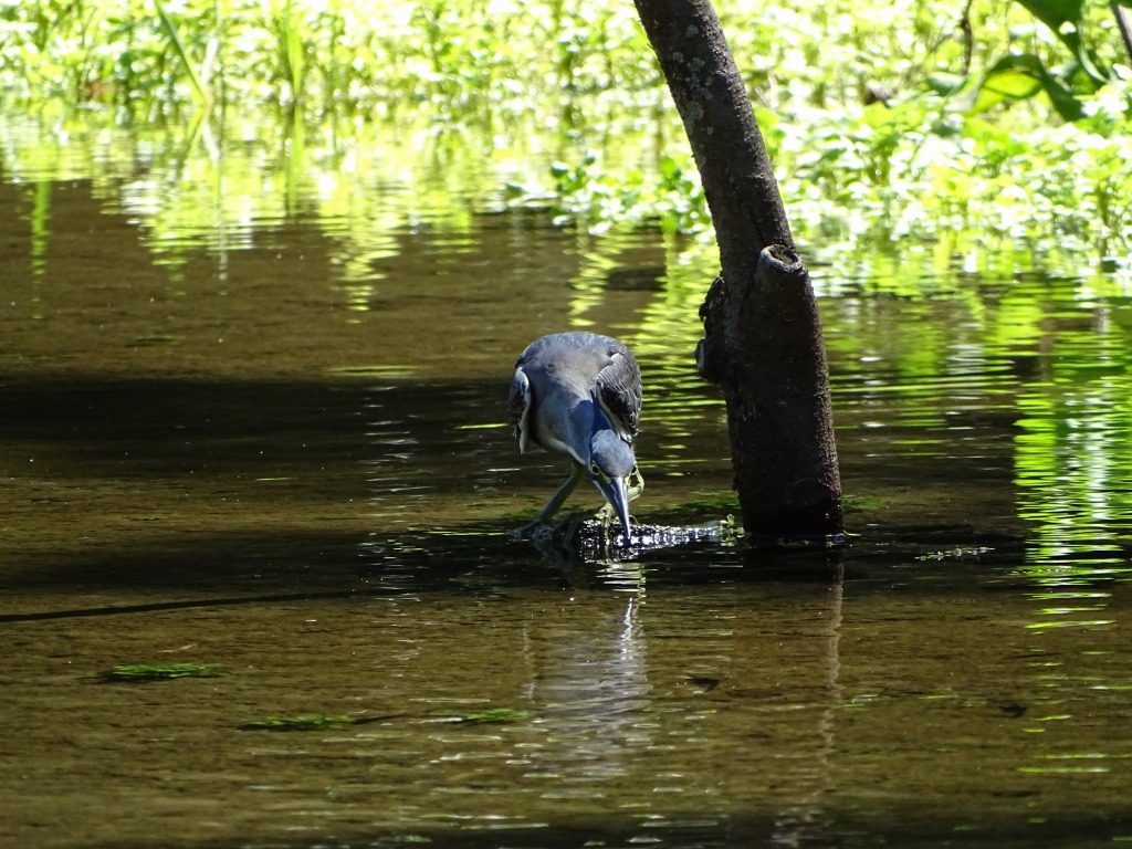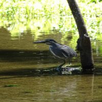 熊本のササゴイは、撒き餌(疑似餌)を使って魚を捕ることで有名です。葉っぱや昆虫などを魚の餌に見立てて水面に浮かべ、寄ってくる魚を捕まえます。ササゴイの「撒き餌漁」や「疑似餌漁」と呼ばれています。その様子を見たいのですが、なかなか難しいです。