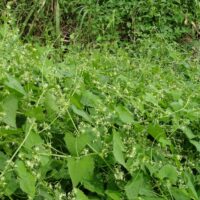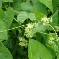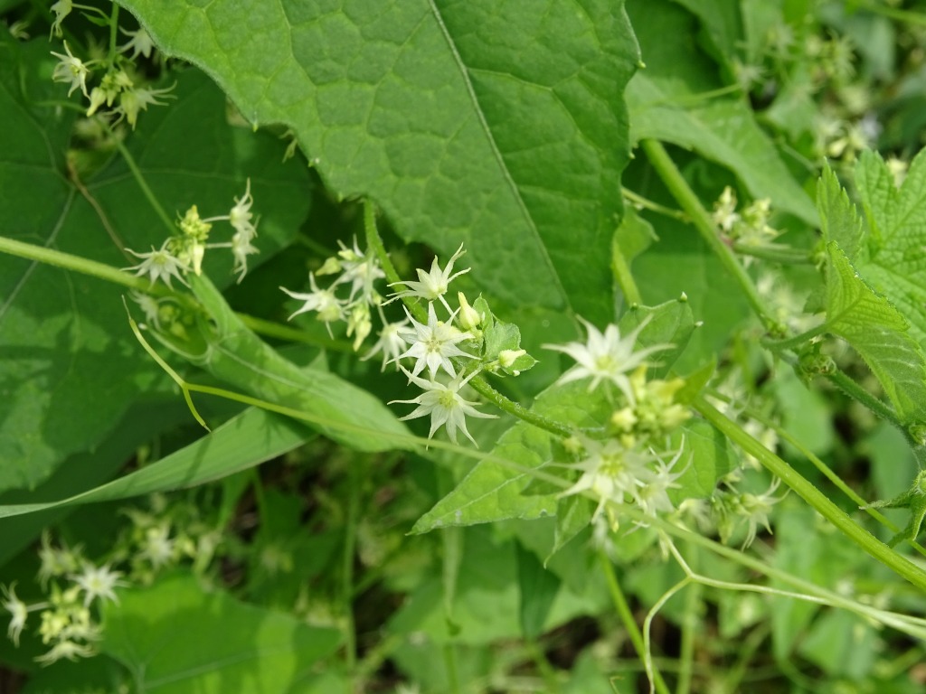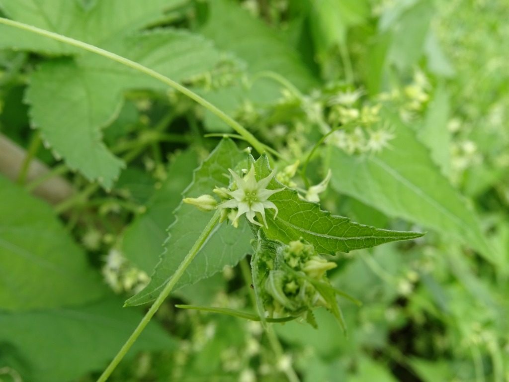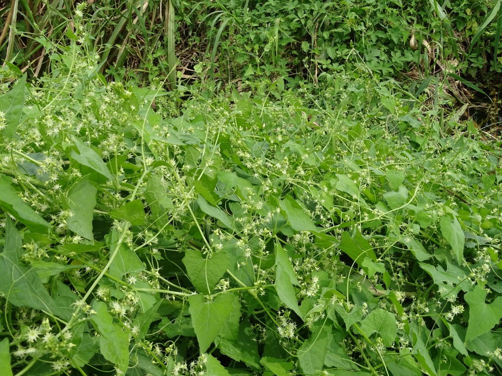 緑色のちょっと地味な花です。地味な花ですが、多くの昆虫たちが蜜を求めてやってきています。ゴキヅルはツル性の植物で、水路を覆いつくさんばかりの勢いがあります。江津湖では茂りすぎている状態ですが、他の場所では少なくなっていると聞きます。アシナガモモブトスカシバの食草でもありますし、残しておきたい植物でもありますね。