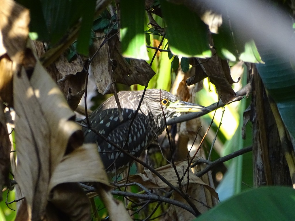 こんにちは、水前寺江津湖公園です。 藪の中にゴイサギの幼鳥を見つけました。体の星模様から、通称ホシゴイとも呼ばれています。 ゴイサギは夜行性ですので、日中はあまり見かけない印象です。夜の江津湖では、陸地に立っているゴイサギをときどき見ることができます。