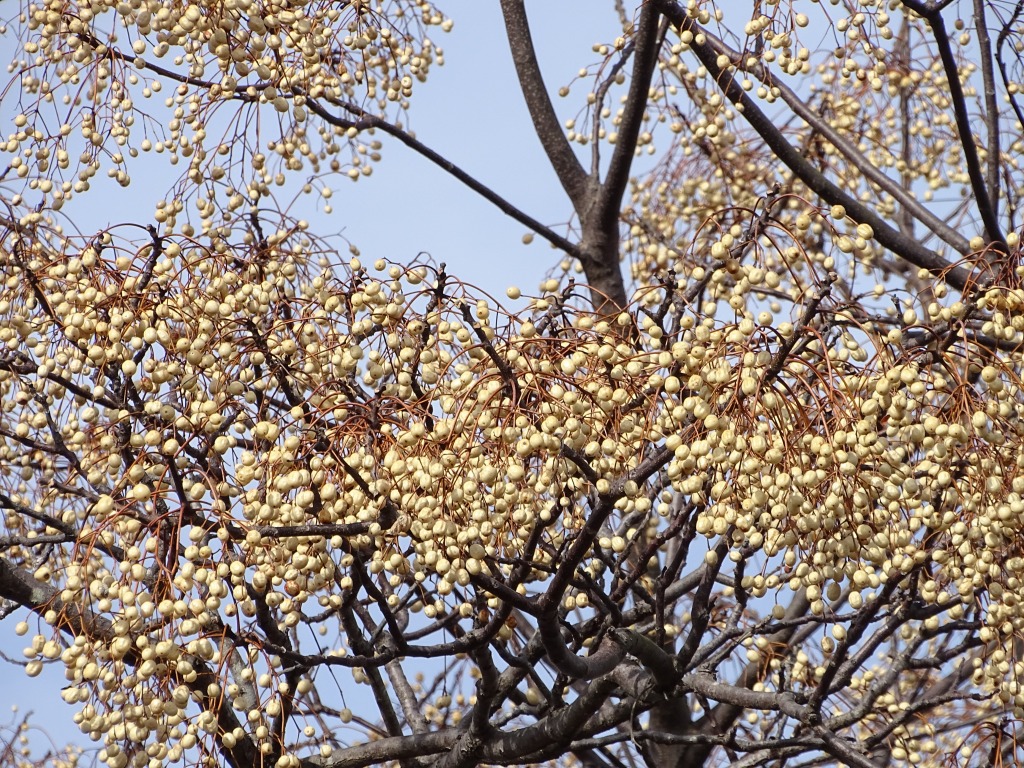 センダンの実です。名前の由来はいろいろあるようですが、実が枝一面に付く様子からきたという説もあるようです。確かに写真のように実がいっぱい付いています。