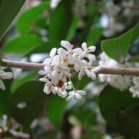 白い花を咲かせているのがギンモクセイです。この花も良い香りがします。 クリーム色の花を咲かせるウスギモクセイも江津湖で見ることができます。