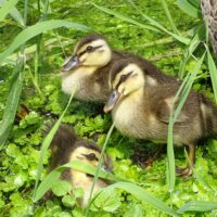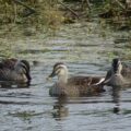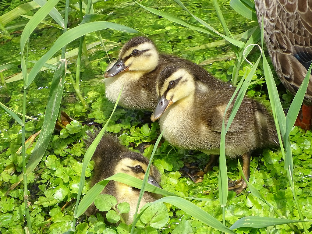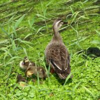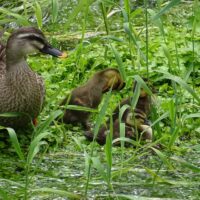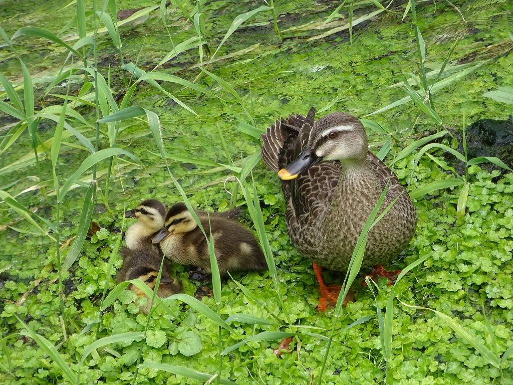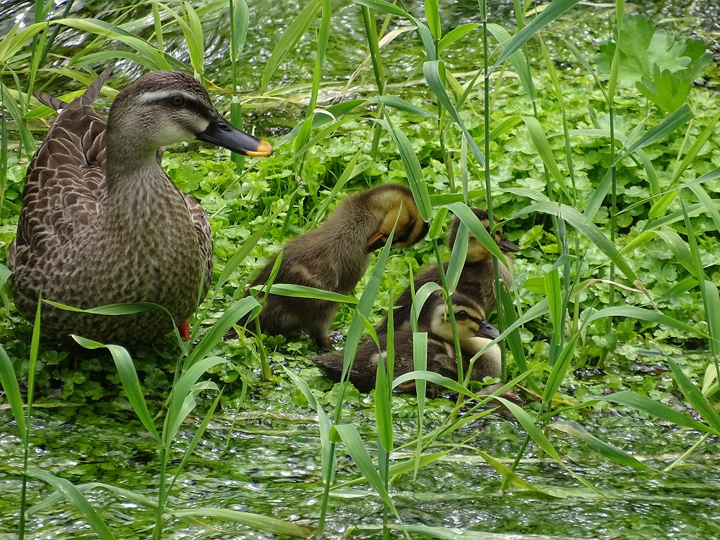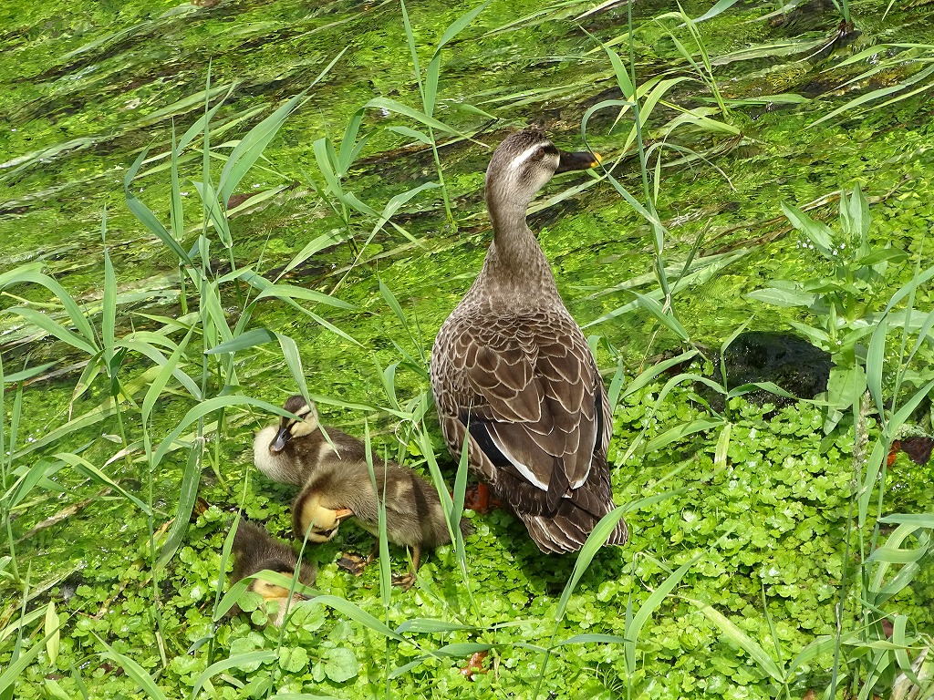 カルガモは、熊本県では留鳥となっており、年中観察できます。なので、江津湖で繁殖して子育てを行うことも時々あります。 3羽の子どもがいました。最初は5羽観察されていたようで、2羽は自然の厳しさに負けてしまったようです。残りの3羽は無事に育ってくれたらいいですね♪