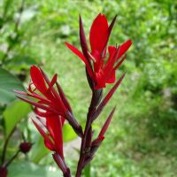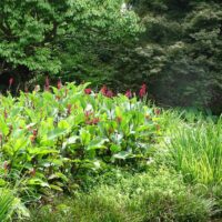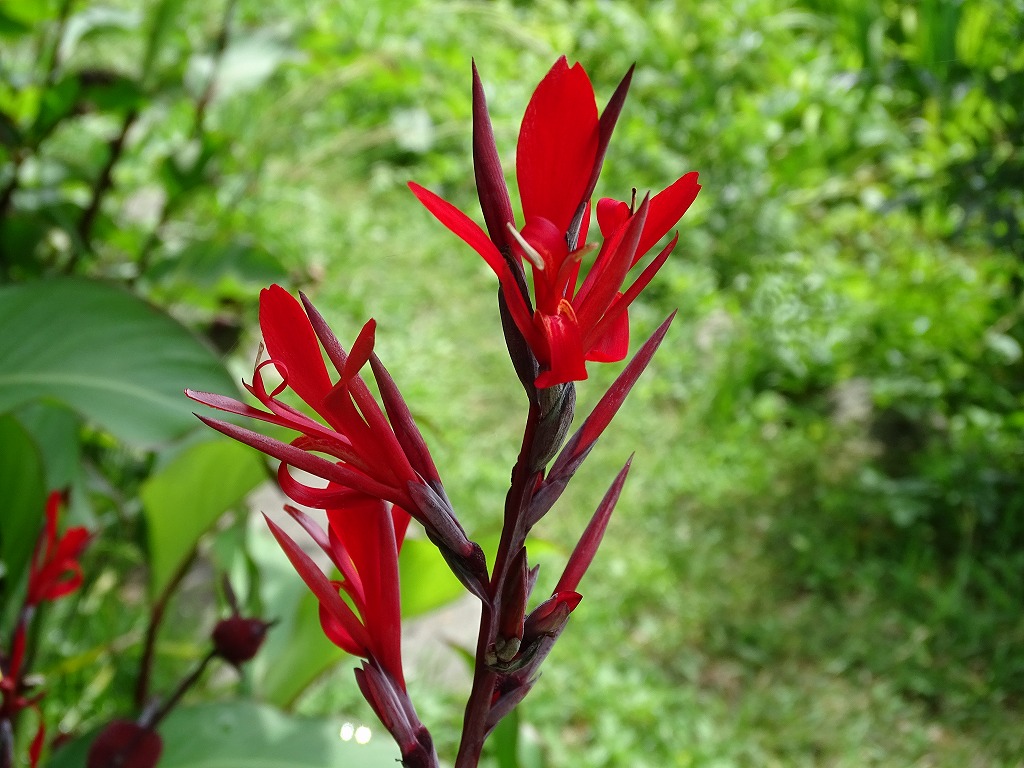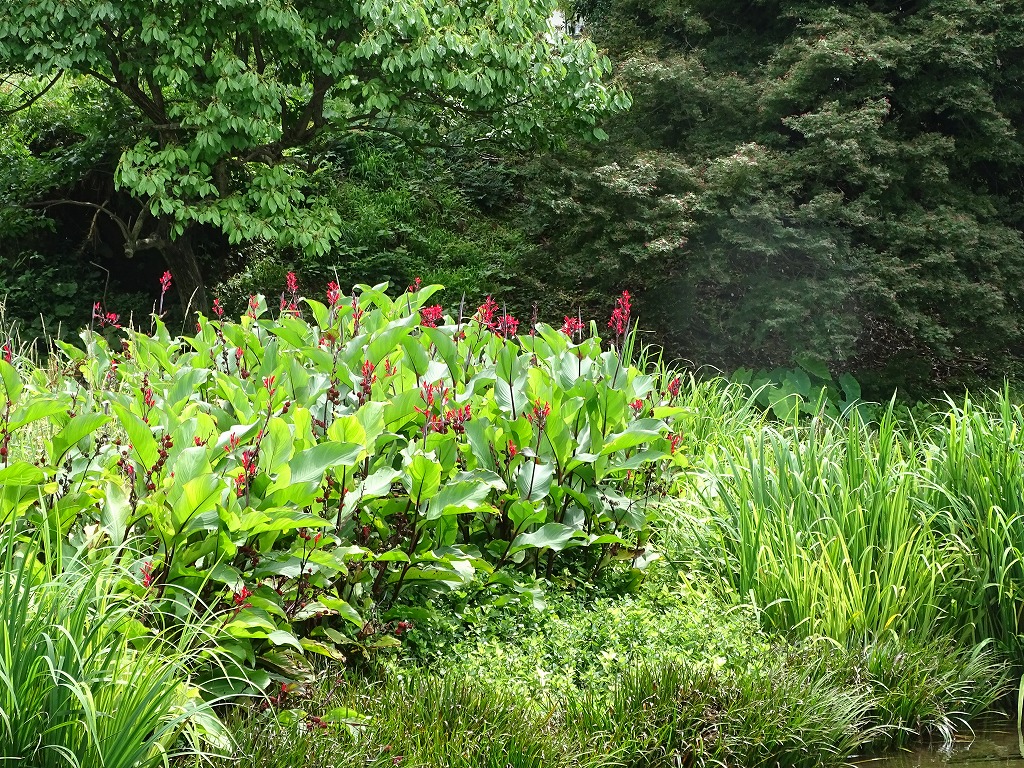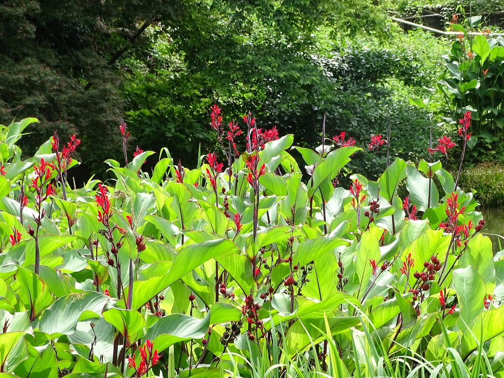 出水地区、県立図書館裏の旧砂取邸跡地の日本庭園にダンドクの花が咲いていました。園芸花として知られるカンナの原種のひとつです。近くで見ると赤色がとても鮮やかです。