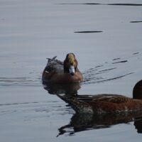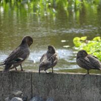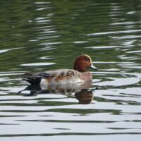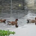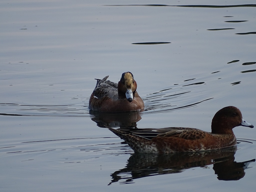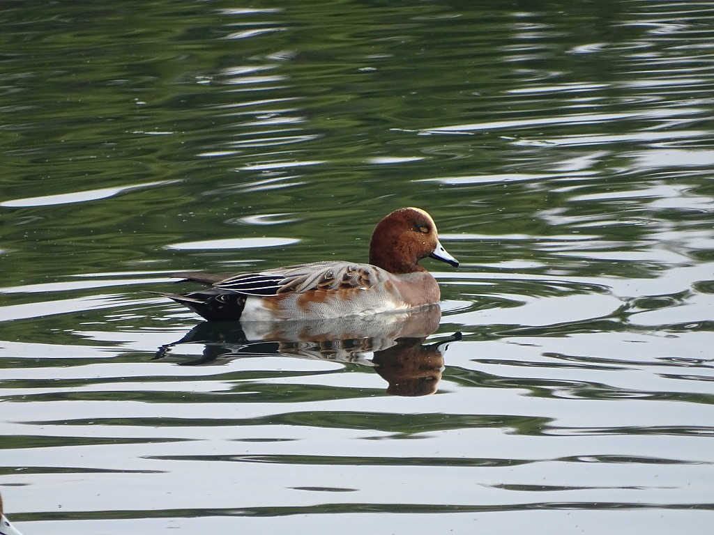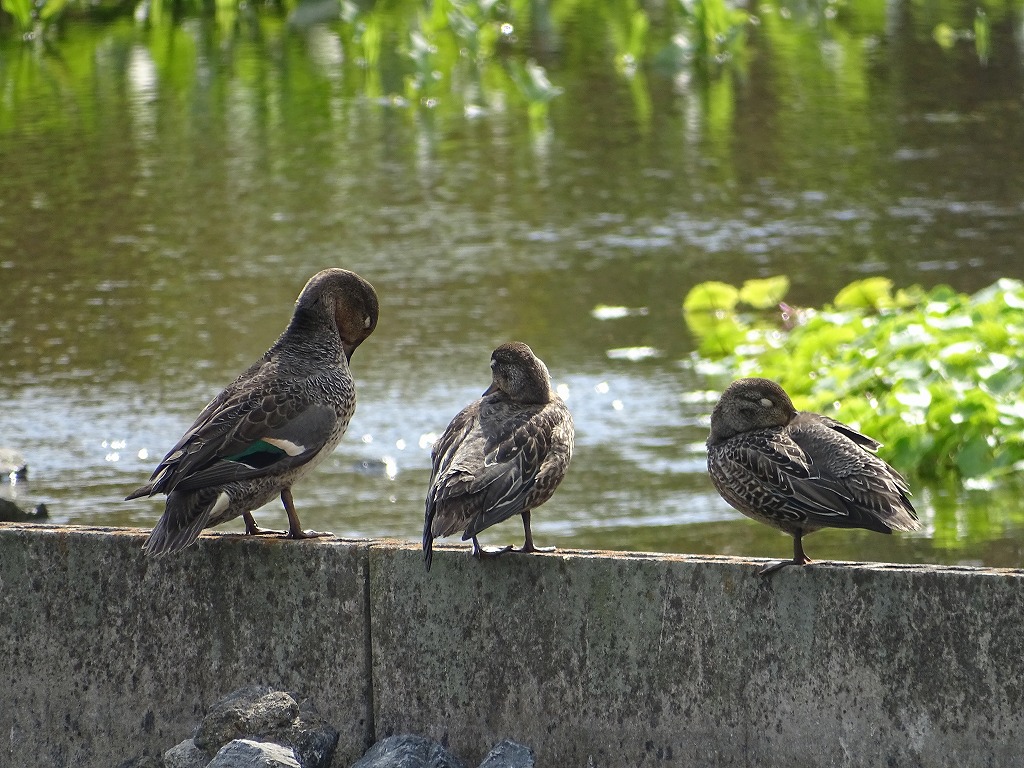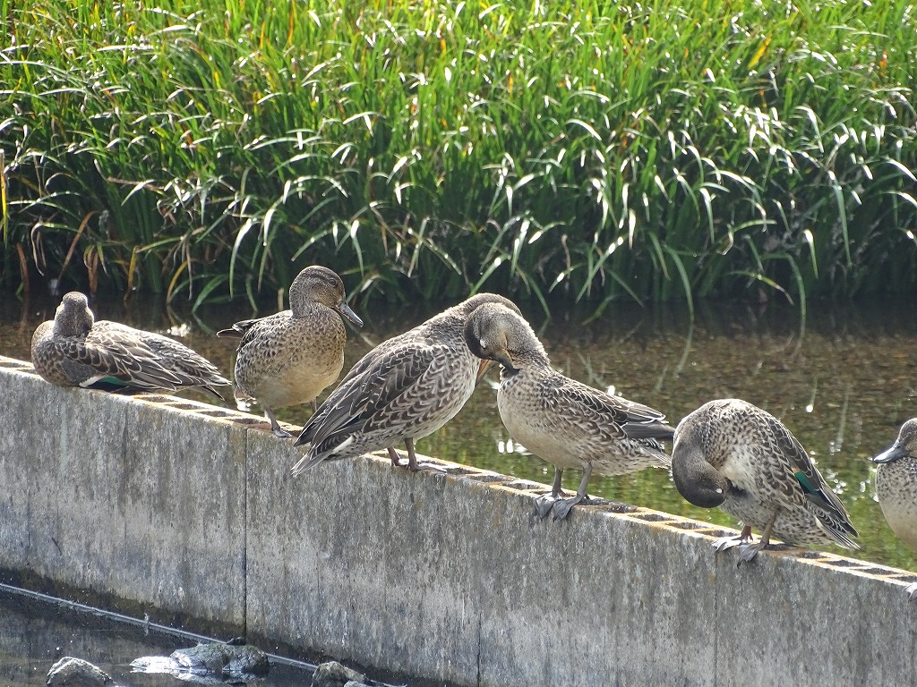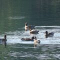 カモたちの体色は、真冬の時期と比べると地味に見え、あまり特徴がありません。写真のカモはヒドリガモやコガモのようですね。