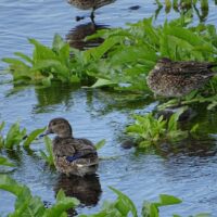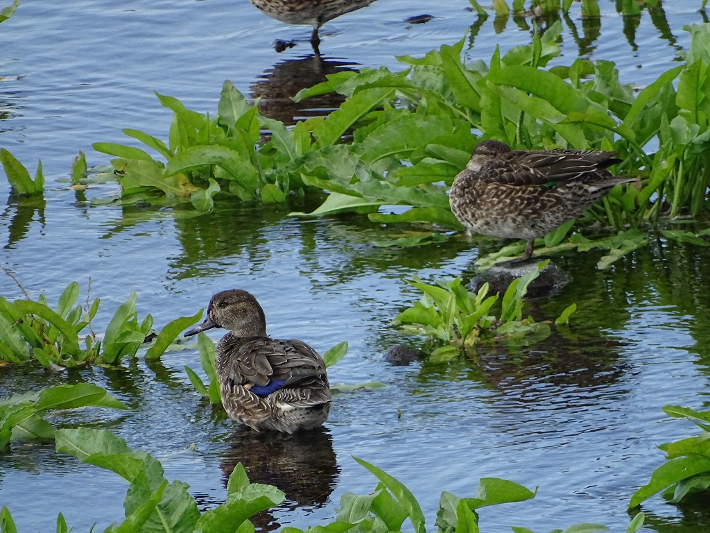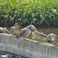コガモのオスは、目のまわりが緑色をしていてとてもきれいですが、今の時期きれいな色をしている個体は少ないようです。メスは、オスと比べて地味な体色です。 江津湖では比較的浅い岸部付近でよく見かけます。ゆっくり休んでいる個体も多いので、じっくり観察できそうです。