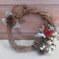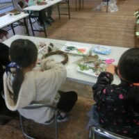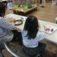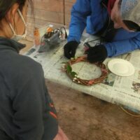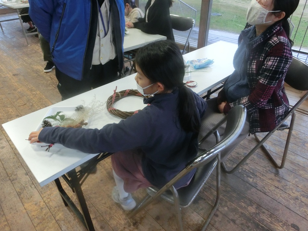 クリスマスリースは、園内で観察できるナンキンハゼの実やクロガネモチの実、ノイバラの実やヒイラギモクセイの葉っぱなどを材料としてつくります。子どもたちはいろいろな材料を使ってリースづくりを始めました。ヨシの穂や葉っぱを差し込んだり、赤い実や松ぼっくりなどを付けたら、だんだんとリースらしくなってきました。ドングリや木の実を付けたりと、子どもらしい素晴らしいリースが完成しましたよ。