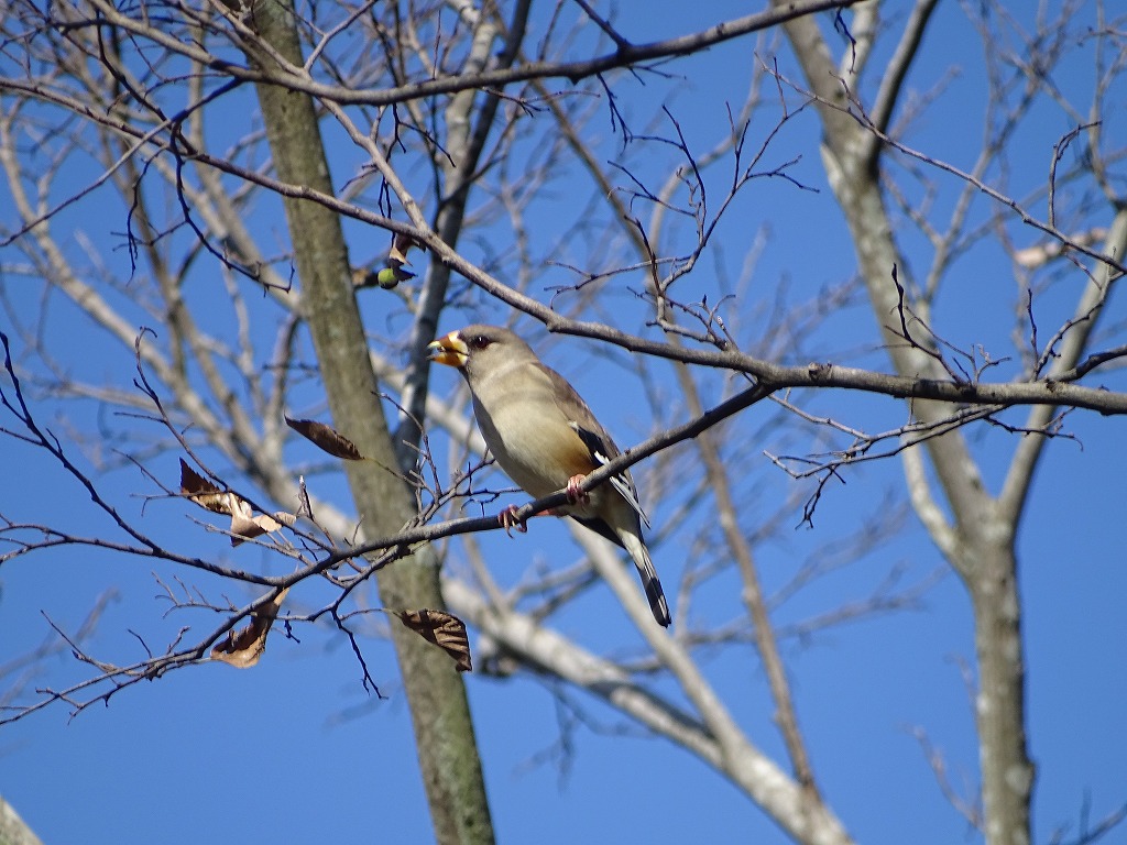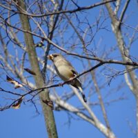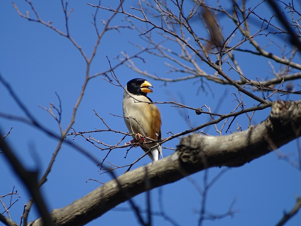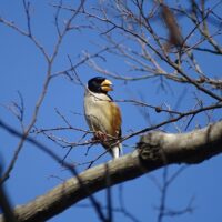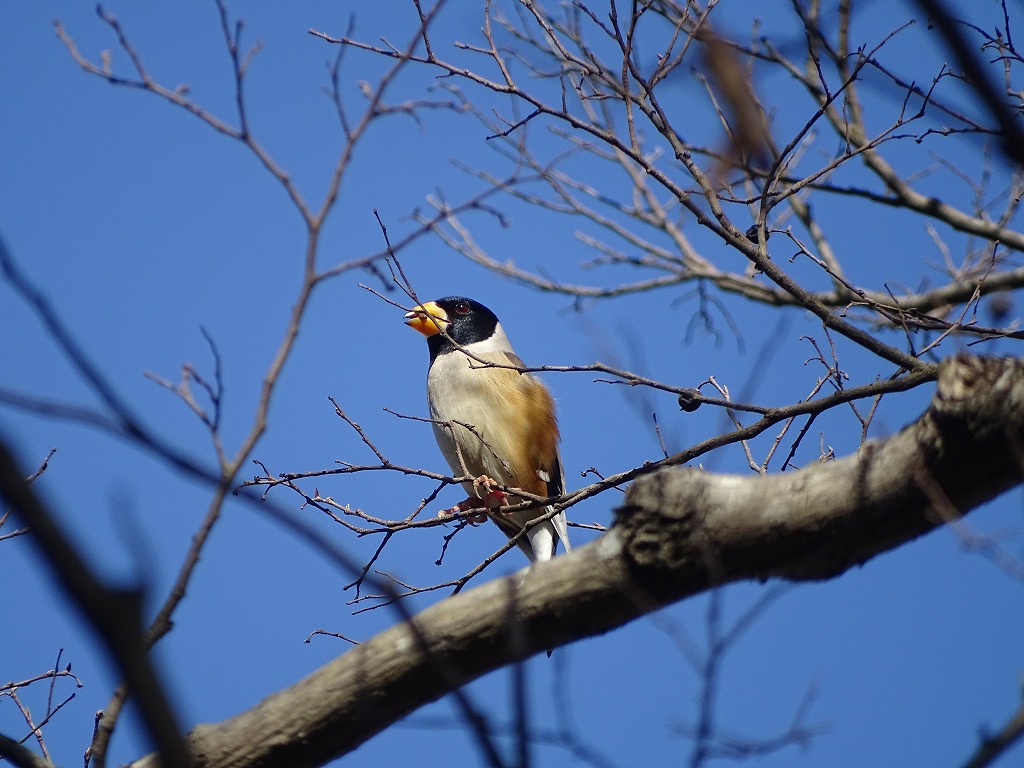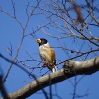 コイカルは、体の一部がうっすら褐色になっているのと、頭の黒い部分の模様の違いでイカルと見分けがつきます。なかなか江津湖では見かけない野鳥ですので、ぜひ探して観察してみてください。