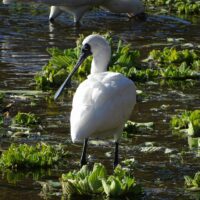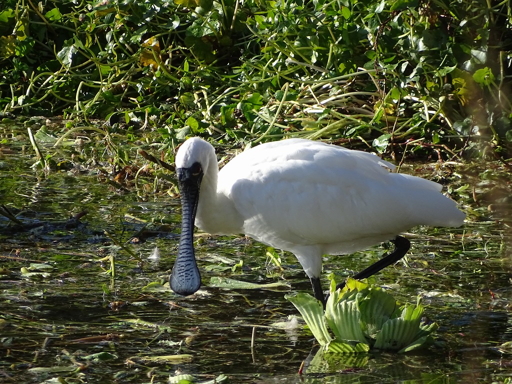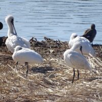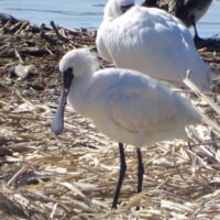 江津湖ではクロツラヘラサギとヘラサギが一緒に滞在しています。昼間はよく顔をうずめて寝ていますので、クロツラヘラサギなのかヘラサギなのかよく分かりませんが、両種合わせて多い時で12羽ほど確認できました。ときどき水草の中に口ばしを入れて、エサをとっているときがあります。その時には、とても近くでじっくり観察できると思います。