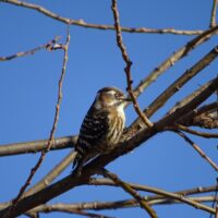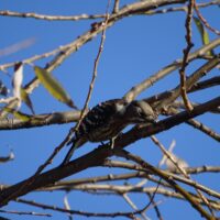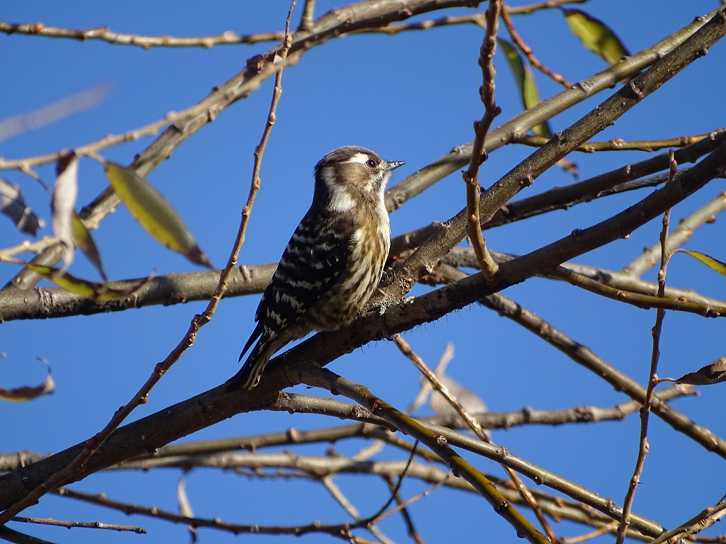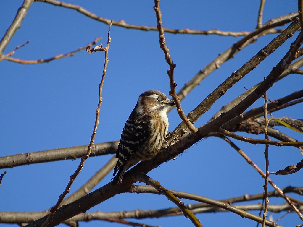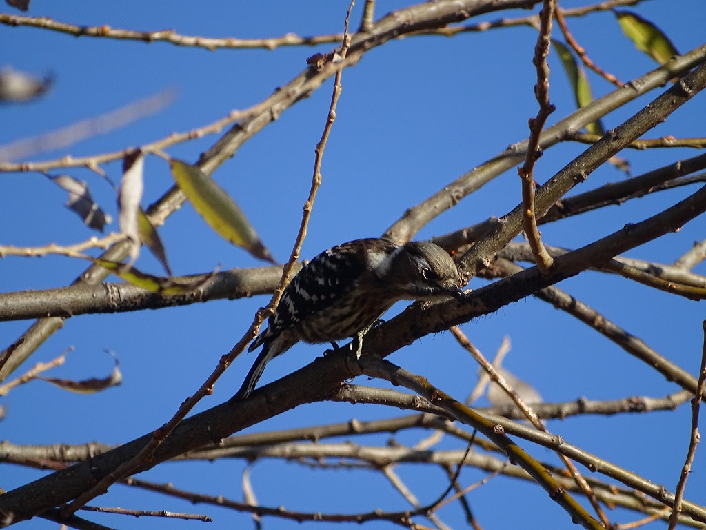 コゲラはキツツキの仲間で、エナガやシジュウカラなどの混群の中で動き回っているようです。「コンコンコンコン」と、キツツキらしく木をたたく音もよく耳にします。小鳥の群れを見つけたら、探してみて下さい。