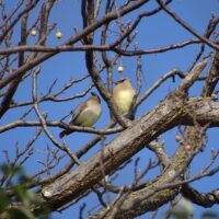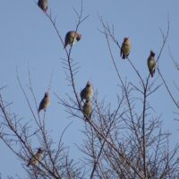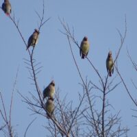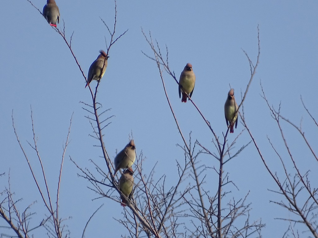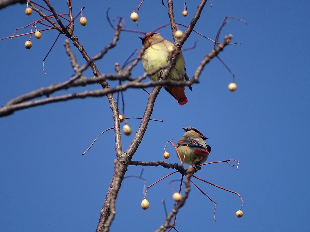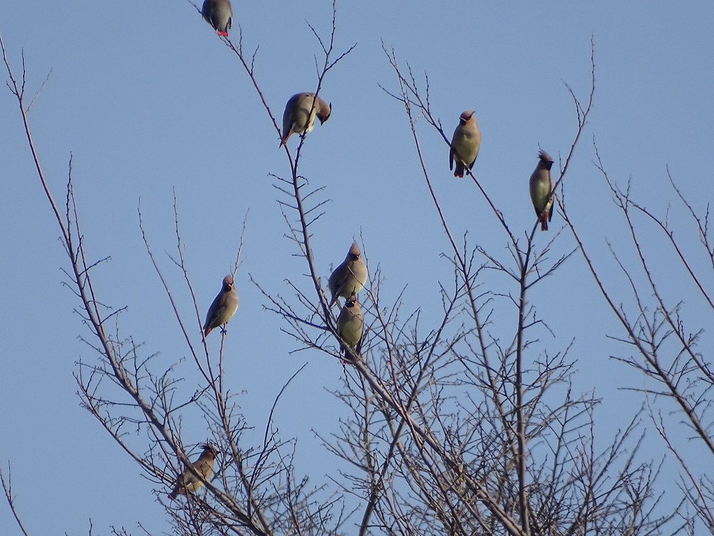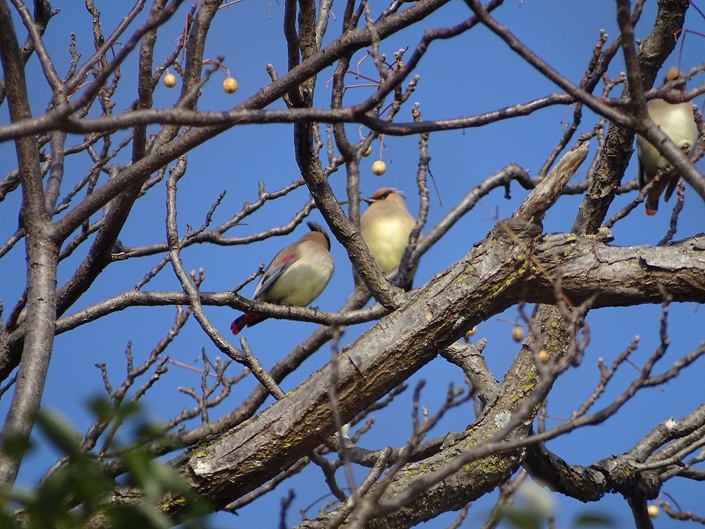 ヒレンジャクは尾の先が赤いです。尾の先が黄色いキレンジャクという野鳥もいますが、江津湖ではキレンジャクはほとんど見かけません。ヒレンジャクはヤドリギという植物の実を好んで食べるようです。ヤドリギは樹木に寄生する植物で、江津湖でも多く見ることができます。ヤドリギの付いている樹木を観察していると、ヒレンジャクを観察できるかもしれません。