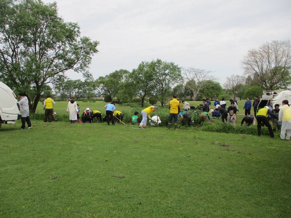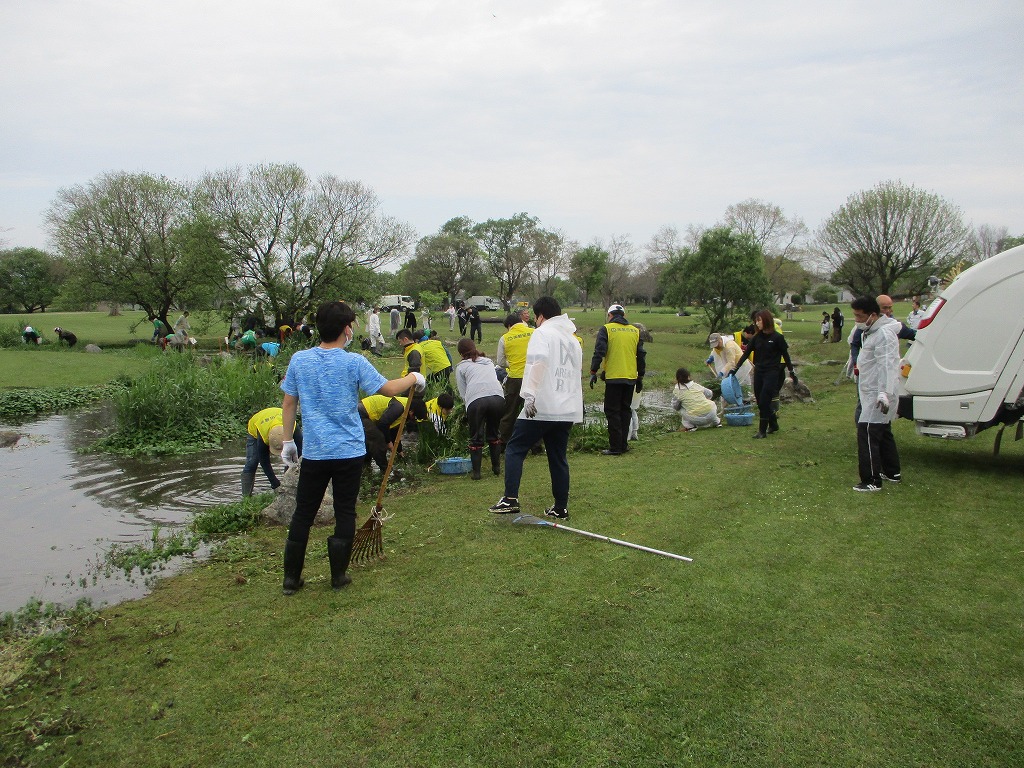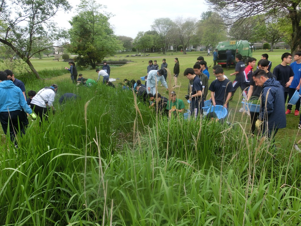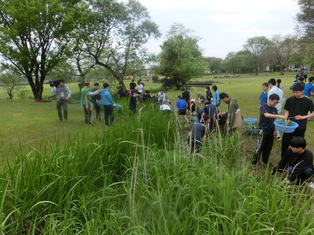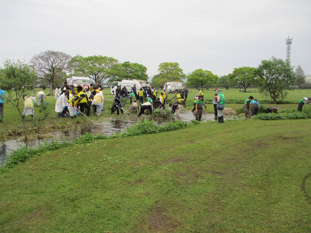 こんにちは、水前寺江津湖公園です。 今日は広木地区で外来水草清掃ボランティア活動が行われました。肥後東ライオンズクラブと熊本工業高校の学生の皆様総勢約250名の参加です。