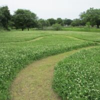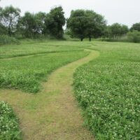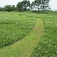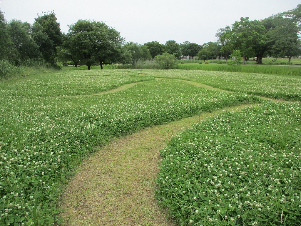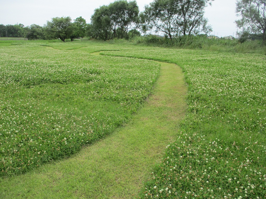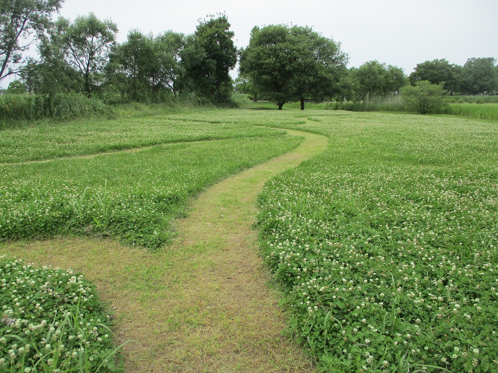 通常はシロツメクサも草刈りの対象になりますが、5月は広木地区自然観察園近くのシロツメクサを刈り残して小道を作っています。