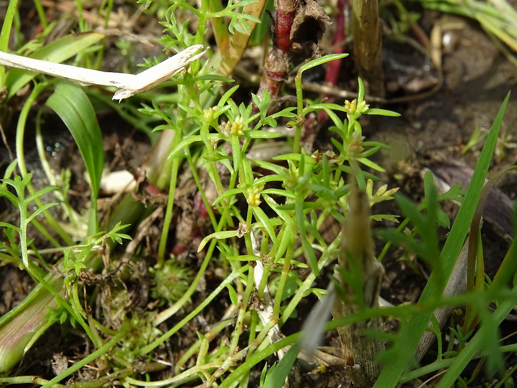 名前にツメクサと付くように、葉が鳥の爪のように細くとがっています。江津湖では、キタミソウと同じく水辺に生育しています。白い花をつけるようですが、花が小さく肉眼では確認しづらいです。全国的にも希少種となっており、江津湖でも一部で見ることができる程度です。