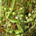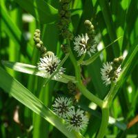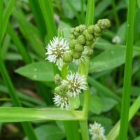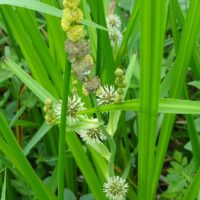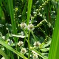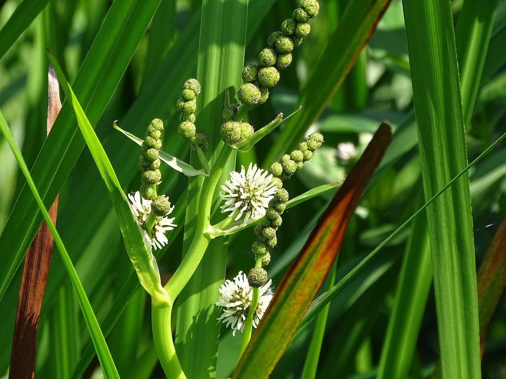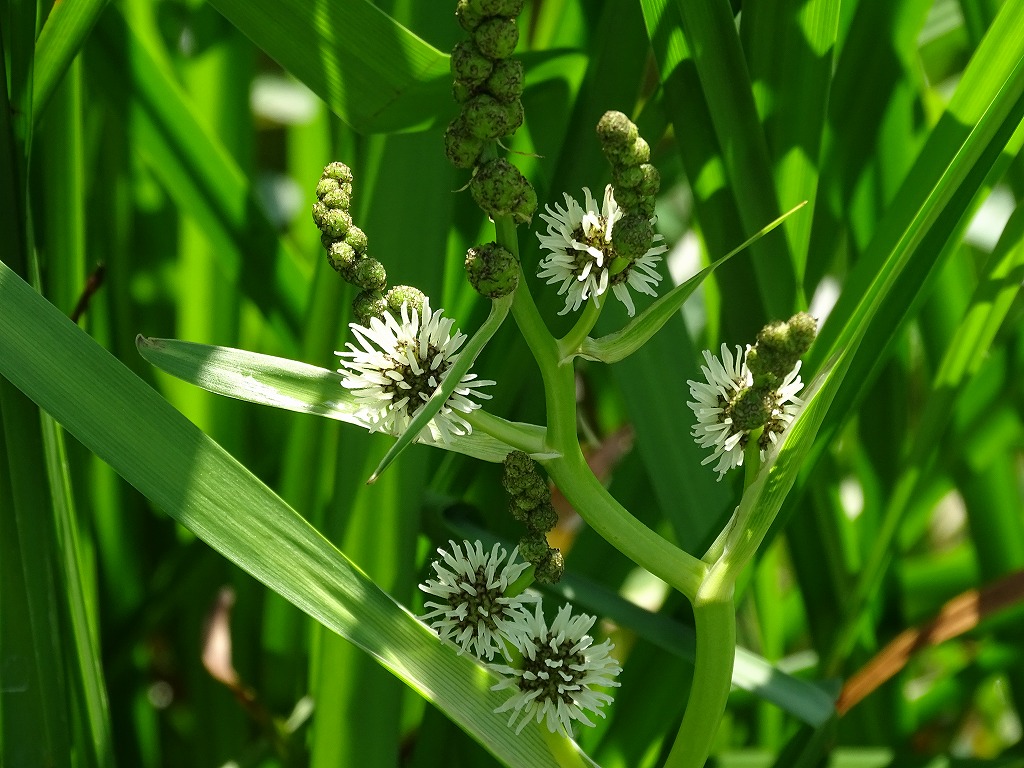 ミクリは、実が栗に似ていることから名前が付けられたようです。実がつくのはもう少し経ってからでしょうか。写真のものはミクリの花で、上部の緑色の丸いものが雄花、下部の白い毬栗のようなものが雌花です。熊本県では希少種となっていますが、江津湖では多く見かける印象です。環境が合っているのでしょうね。 葉は、5月の節句のショウブの葉に似ています。ショウブの葉は独特のいい香りがしますが、ミクリには独特の香りがありません。