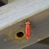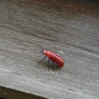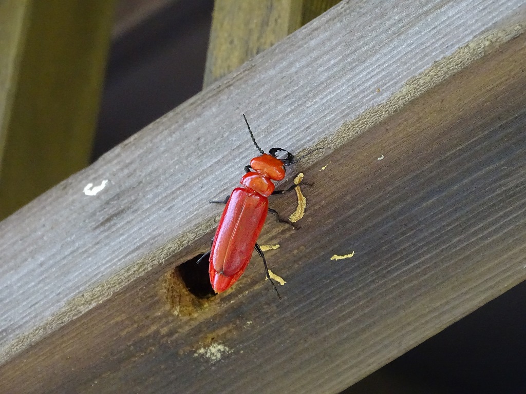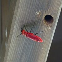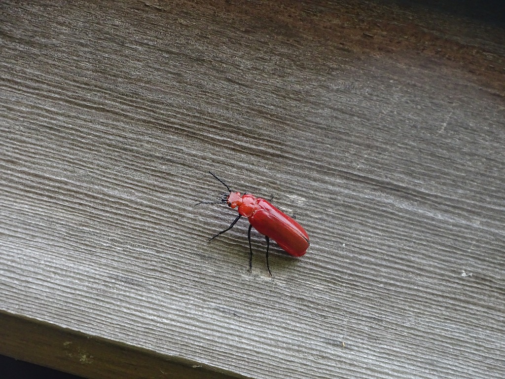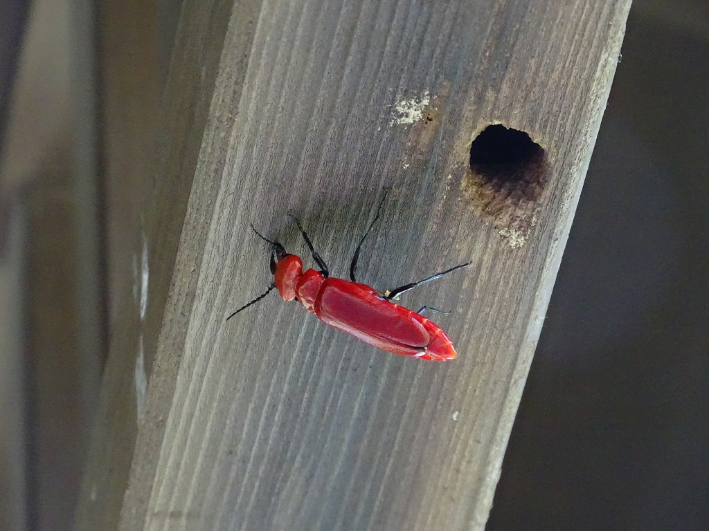 今季も園内でヒラズゲンセイを見ることができました。真っ赤な体の昆虫です。