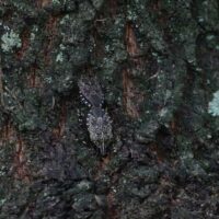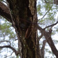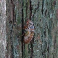 そして、いよいよセミの羽化の観察です。まずは木に登っているセミの幼虫を探します。よく探してみると、いました、たくさんの幼虫が木に登っています。