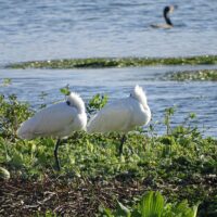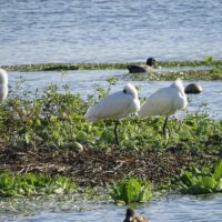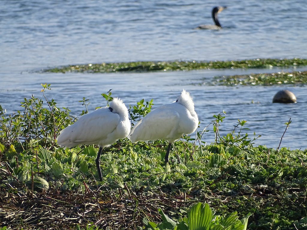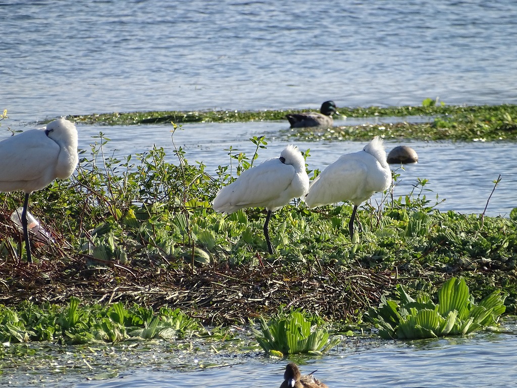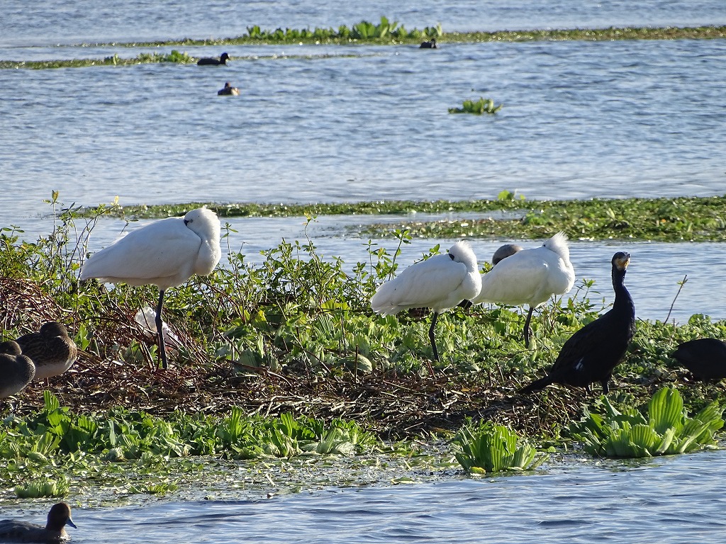 見かけた時はずっと顔を隠して寝ていましたので、どちらがクロツラヘラサギなのかヘラサギなのか、見分けるのは難しかったです。体の大きい方がヘラサギのような気がします。タイミングが合えば、ヘラ状の口ばしを出している姿を見ることができると思います。この日は計4羽見かけました。寒さが厳しくなるころには、もう少し数も増えてくるかもしれません。