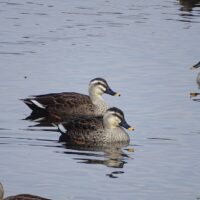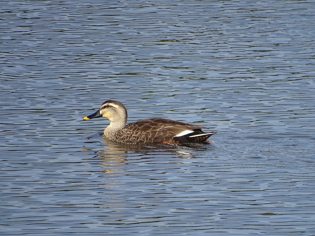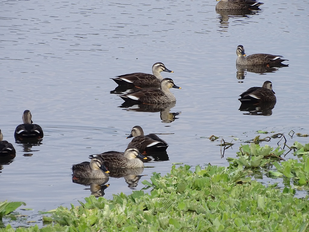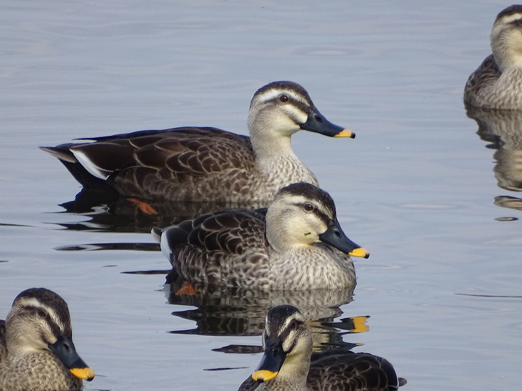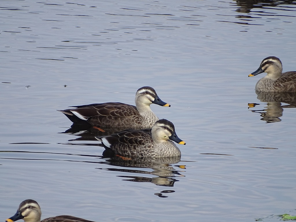 カルガモは、熊本県では留鳥となっており年中観察できますが、夏の暑い時期は少なく感じます。寒くなるにつれ数が増えてきた印象です。カルガモは、くちばしの先が黄色いのが特徴です。他のカモとはそこを見て区別すると分かりやすいです。