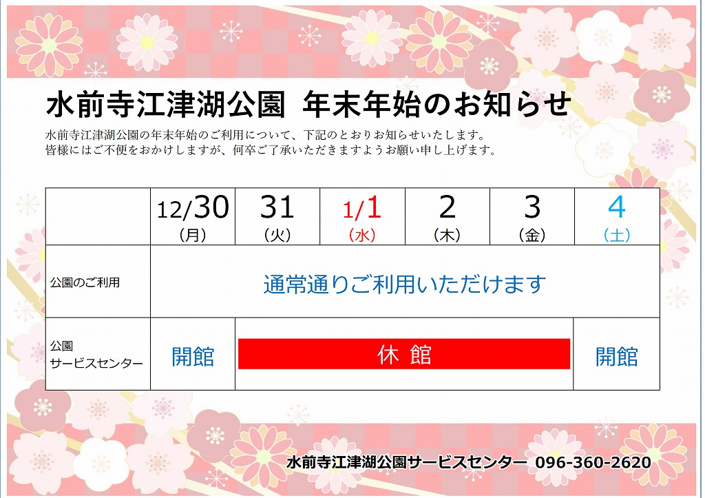 今年も残すところ今日のみとなりました。今年も水前寺江津湖公園をご利用いただきありがとうございました。また、このブログを見て頂きありがとうございました。 2025年も多くの人にご来園いただき、少しでも有意義な時間を過ごして頂けるようにスタッフ一同がんばりたいと思います。
