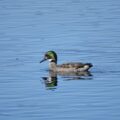 緑色に光る、ナポレオンハットのような頭が特徴です。晴れていたということもあり、以前紹介した時よりも頭の緑色がとてもきれいに見えます。また、後ろの方の羽が垂れ下がっているのも特徴の一つで、この個体もきれいに垂れ下がっているのが分かります。江津湖での数は少ないですが、上江津湖や下江津湖をしっかり探してみると、見つけることができると思います。