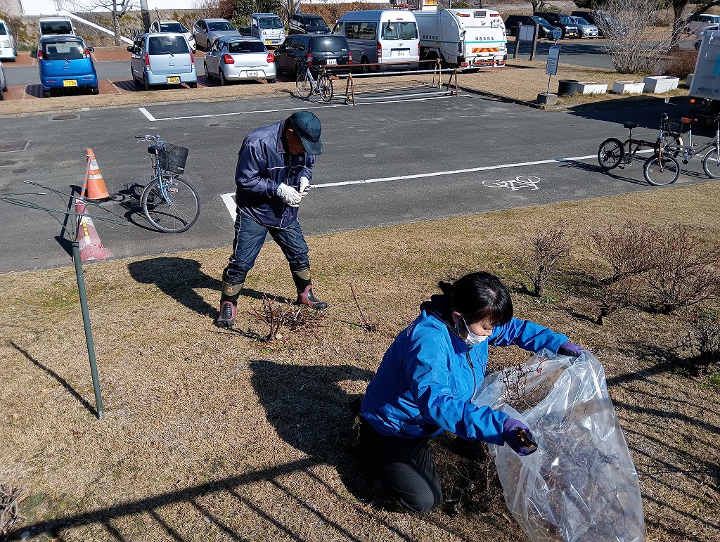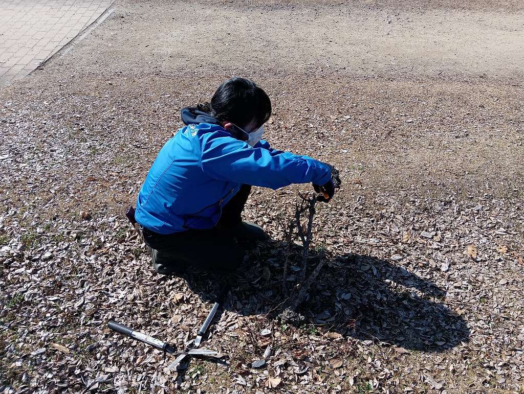 こんにちは、水前寺江津湖公園です。 今日はよい天気となりました。今日は広木地区にあるバラの剪定作業を実施しました。