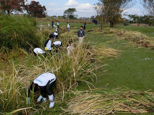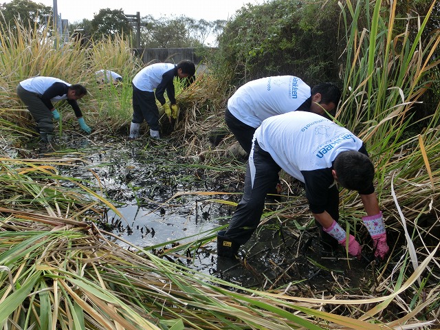 これは、とても骨が折れる作業で、かつ泥まみれにもなってしまう作業なのですが、女性スタッフまで一緒になって、懇切丁寧な作業をいただきました。おかげさまで、次回の草の繁茂がかなり抑制できたと思われます。サニクリーン九州の皆さま、大変な作業をありがとうございました!