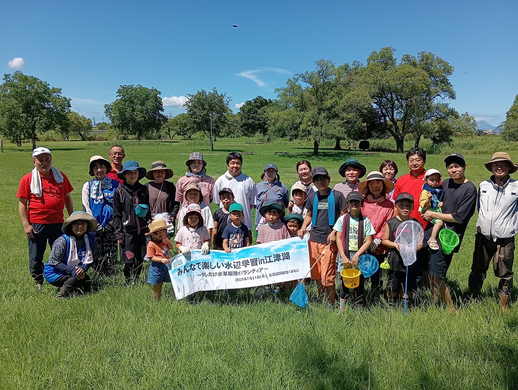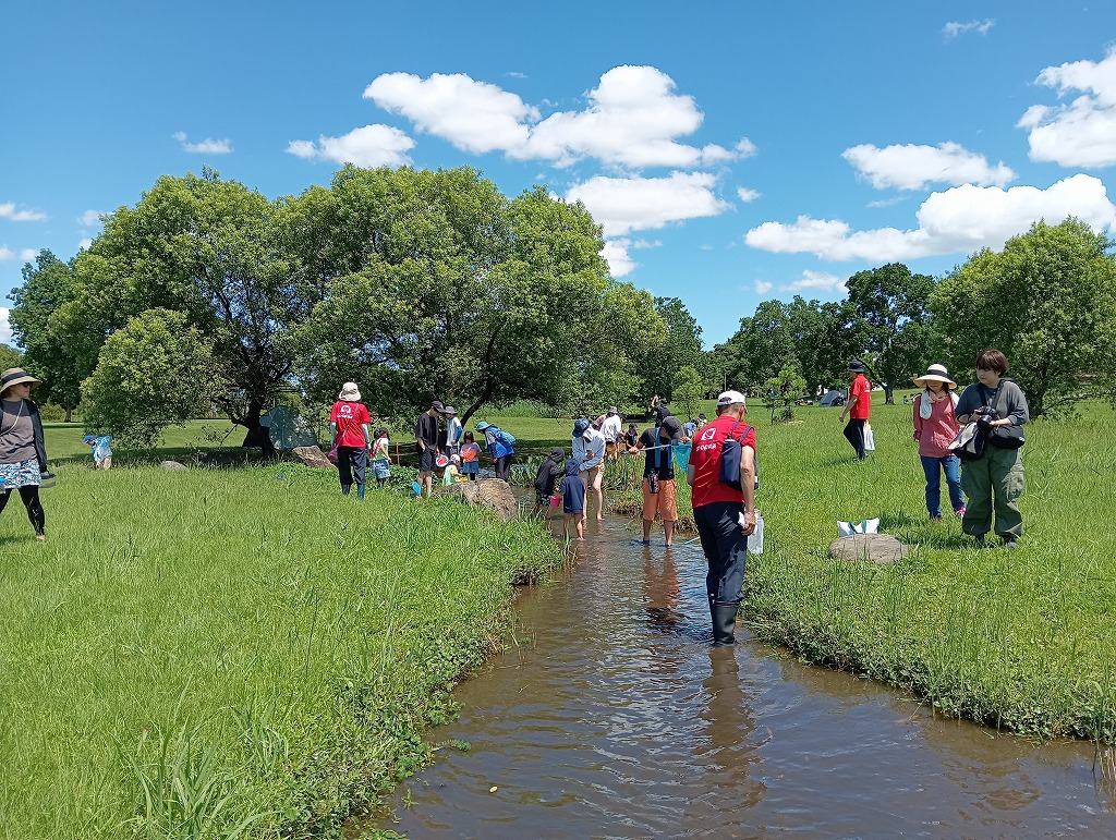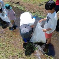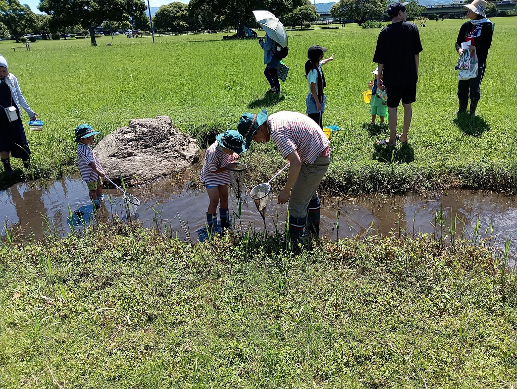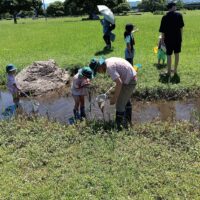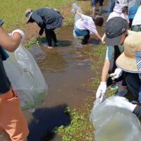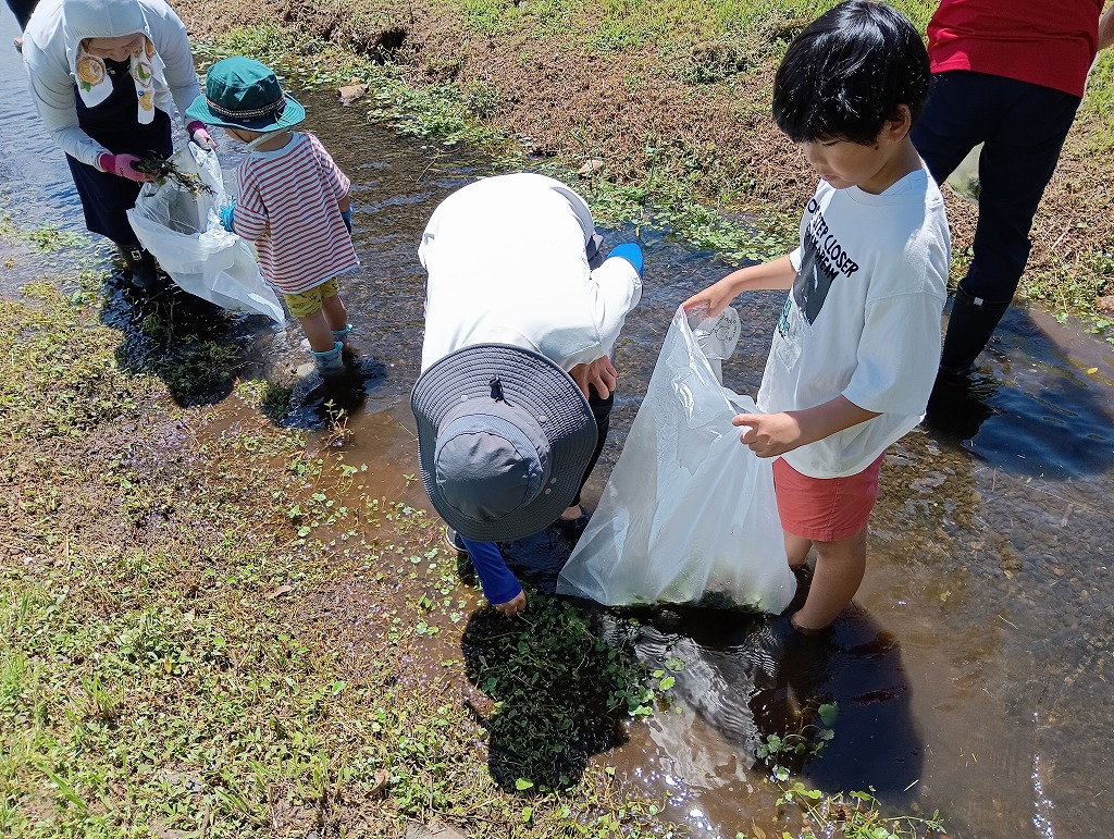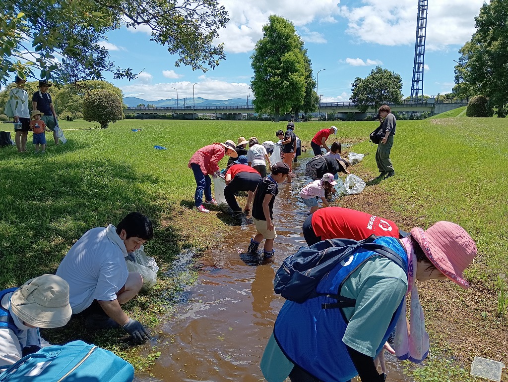 水路にはびこるブラジルチドメグサやナガエツルノゲイトウなどの外来水草を除去していただきました。水辺の生きもの観察や外来水草清掃を通して、子どもたちには江津湖の自然を感じていただけたと思います。参加された皆様、暑い中お疲れさまでした。
