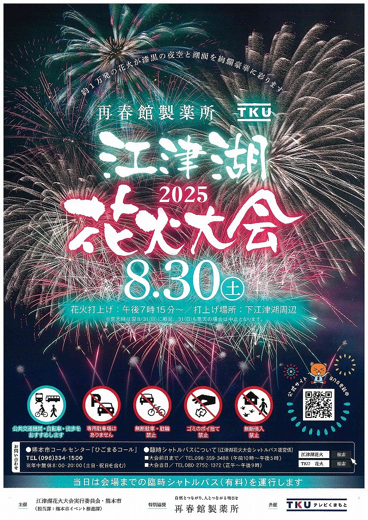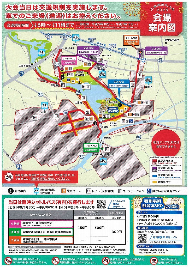 なお、広木地区と下江津地区艇庫駐車場は8月27日の閉門時間以降、上江津地区大曲駐車場は8月29日の閉門時間以降一般の方の駐車はできなくなりますので、ご来園の際はご注意ください。また、花火大会の詳細(概要・交通規制・臨時バス)につきましては、「熊本市」のホームページよりご覧いただけます↓