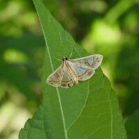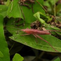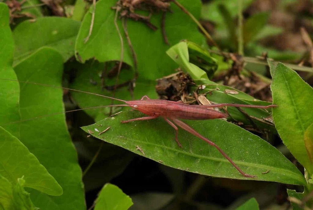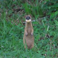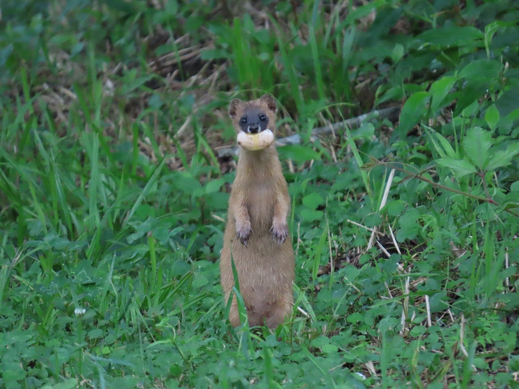 ガの仲間もいろいろ観察できます。きれいなガから枯葉のように地味なガまでいろいろいておもしろいですね。ピンク色のクビキリギスはあまり見かけません。チョウセンイタチはよく見かけます。いつも走っている場面を見かけますが、今回は何かをくわえてじっとしていました。