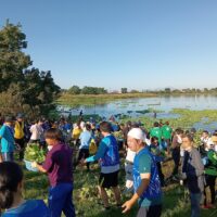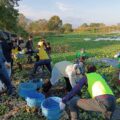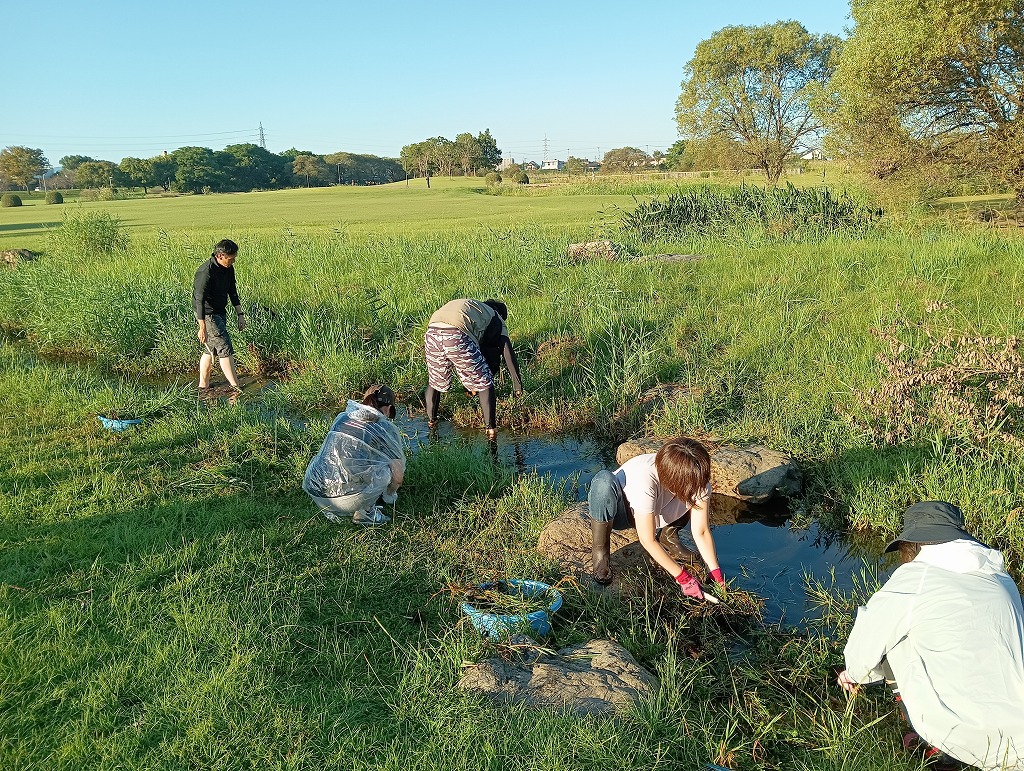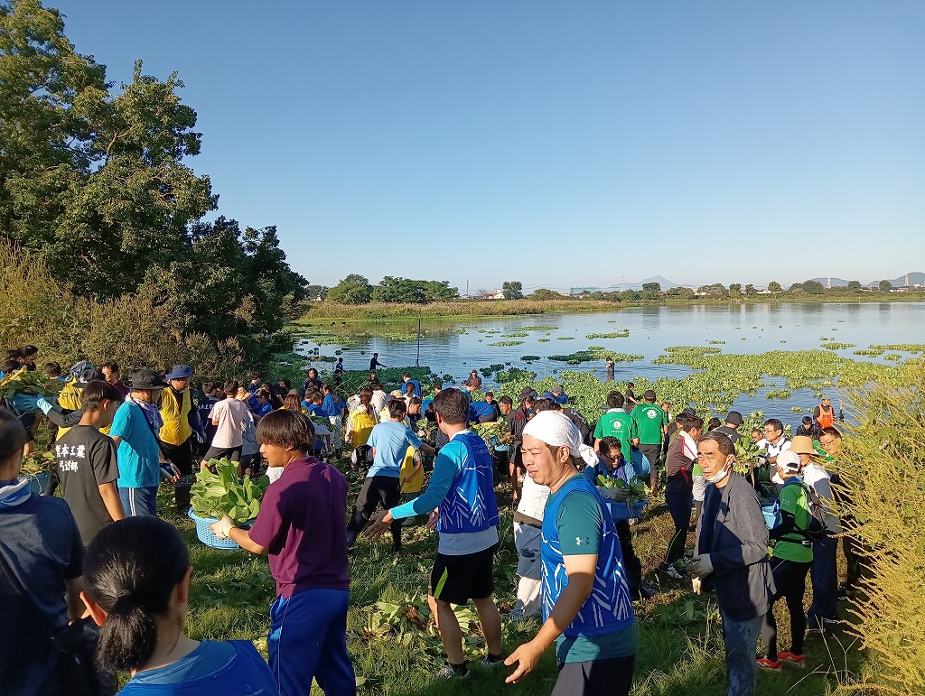 今回は湖岸や水路に蔓延るウォーターレタス(ボタンウキクサ)やナガエツルノゲイトウ、ブラジルチドメグサなどの外来水草の除去作業を行っていただきました。約2時間の作業で、たくさんの外来水草を撤去できました。多くの人たちのがんばりでとてもきれいになりました。ご協力いただいた皆さま、お疲れさまでした。