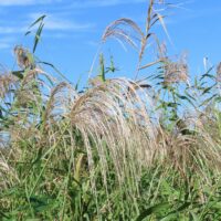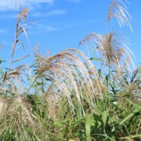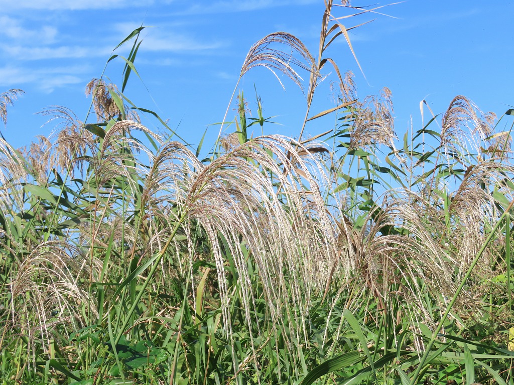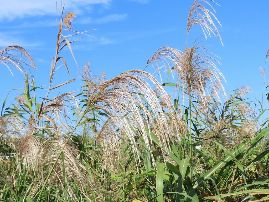 江津湖でのススキの数は少なく、多くはオギかヨシという植物です。白っぽくきれいな穂はオギで、少し茶色っぽい色の穂はヨシとなります。穂が風に揺れるさまは、秋の風情を感じますね♪