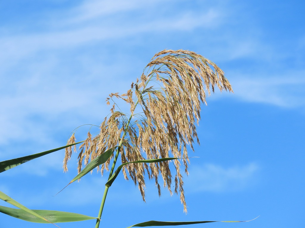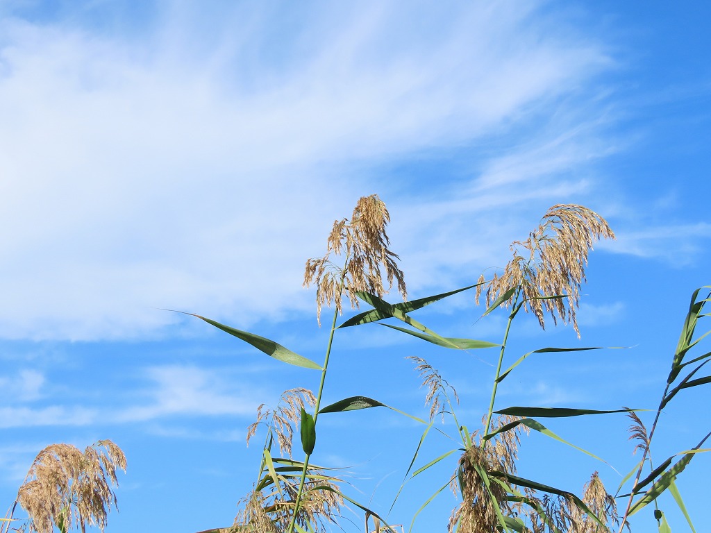 こんにちは、水前寺江津湖公園です。 江津湖では秋らしく穂が風になびいています。ススキがきれいと言われるのをよく聞きますが、実はこの穂はススキの穂ではなく、オギ、ヨシという植物の穂です。