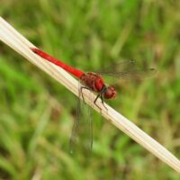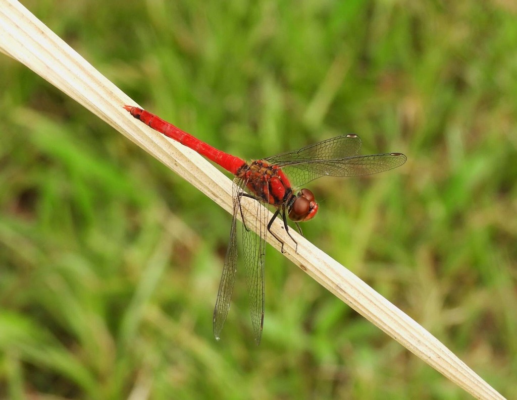 ナツアカネは名前に「夏」と付きますが、江津湖で見かけるのは涼しくなった今の時期です。暑い時期は涼しい場所に移動しているのでしょうか。江津湖での数は少なく、探してもなかなか見つけることができないトンボとなっています。江津湖ではアキアカネも時々見かけます。アキアカネとの区別は、ナツアカネのオスは顔まで真っ赤になっていますので区別はできそうですが、メス個体はアキアカネととても似ています。胸の模様などを見て区別する必要がありそうです。