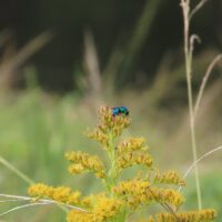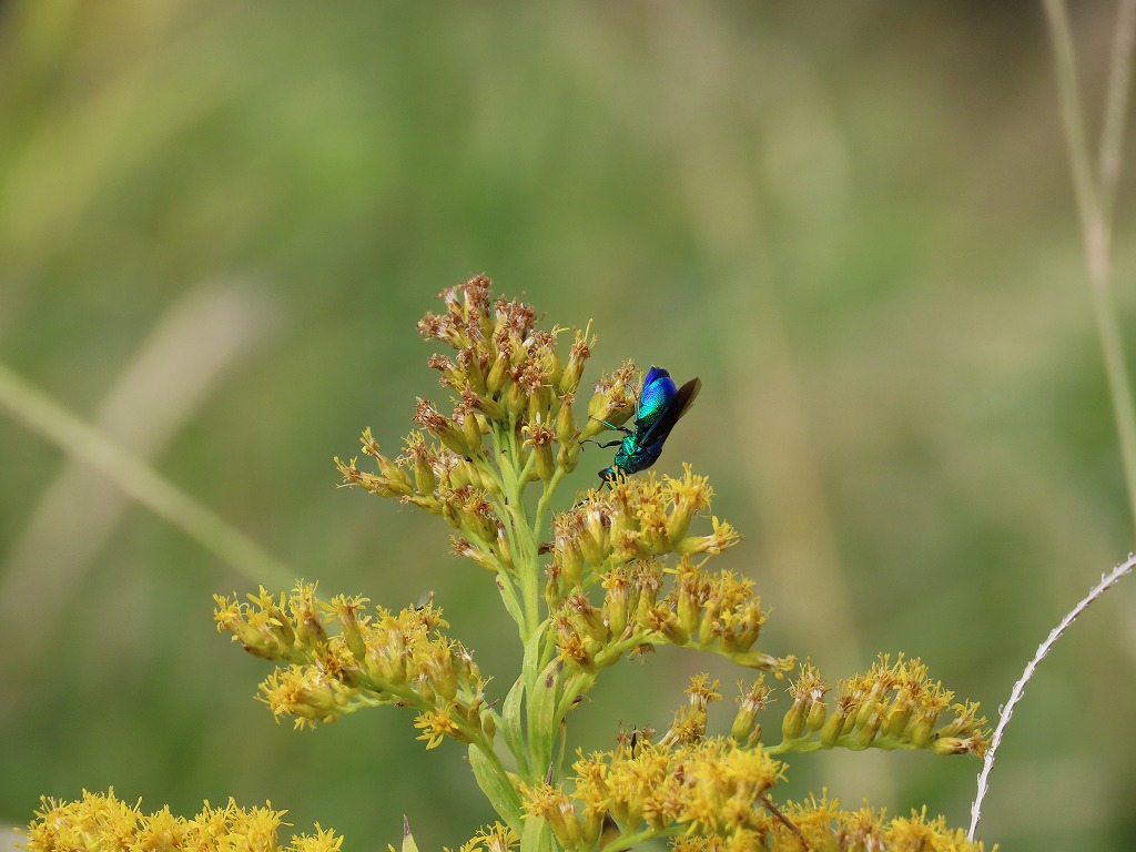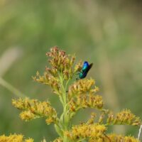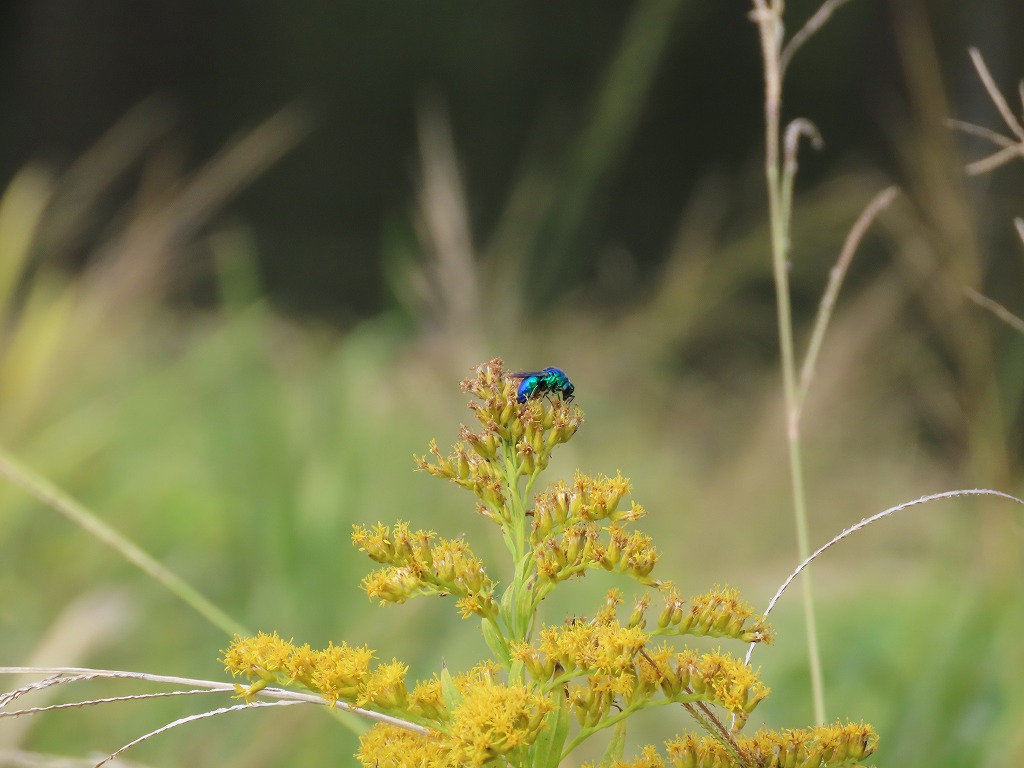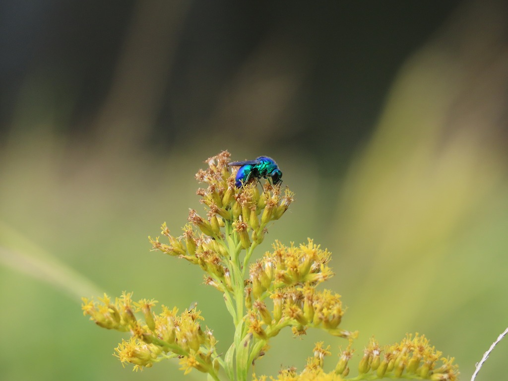 体全体が青色に光っており、とてもきれいなハチです。漢字で「大青蜂」ですので、その名の通りの青いハチですね。この日は1匹だけの観察でした。数は少ないと思います。セイタカアワダチソウなどの花を探してみると、見つけることができるかもしれません。