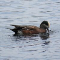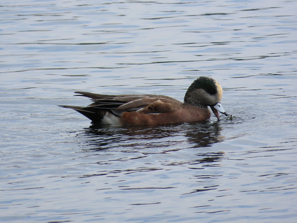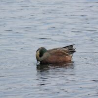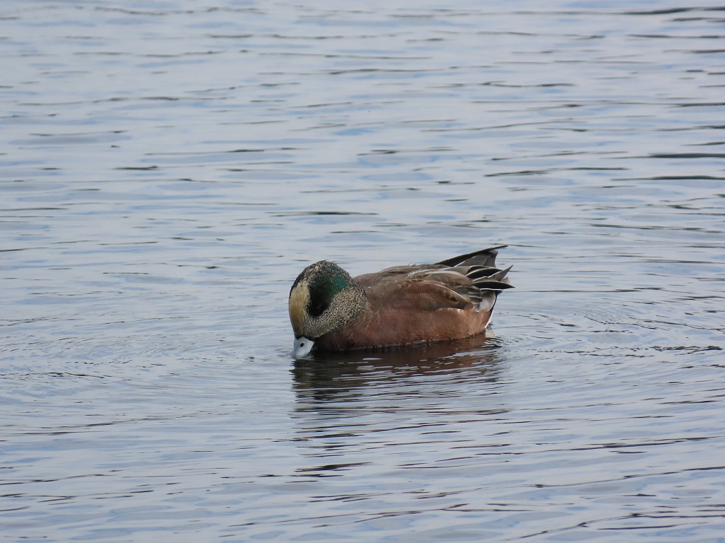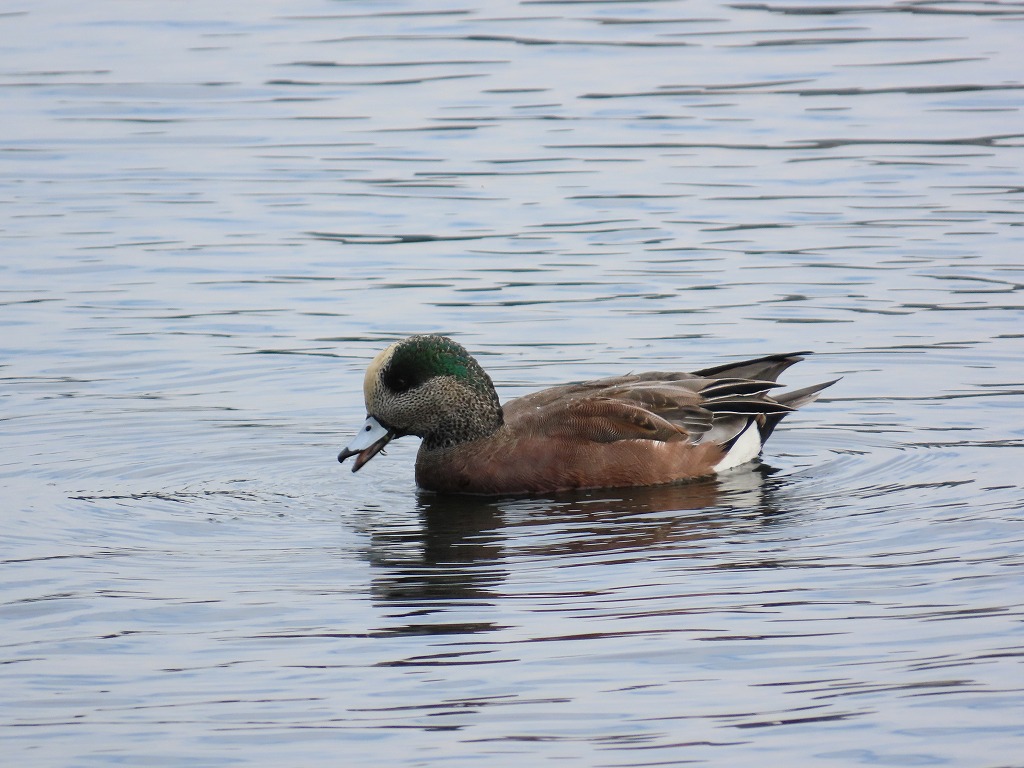 江津湖では珍しいカモですが、毎年1~2羽ほどやってきます。江津湖でよく見かけるヒドリガモの近縁種で、ヒドリガモの特徴であるモヒカン頭はそのままに、ヒドリガモと違い頭が緑色をしています。毎年3月頃までは滞在してくれますが、今季はどこかへ移動してしまったのか、見かけない日も多くなりました。上江津、下江津とも見かけています(同一個体かは分かりませんが、別個体のような気がします)。カモの群れの中をしっかり探してみると、見つけることができるかもしれません。