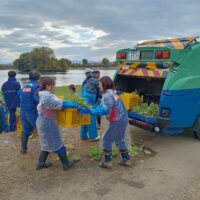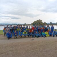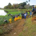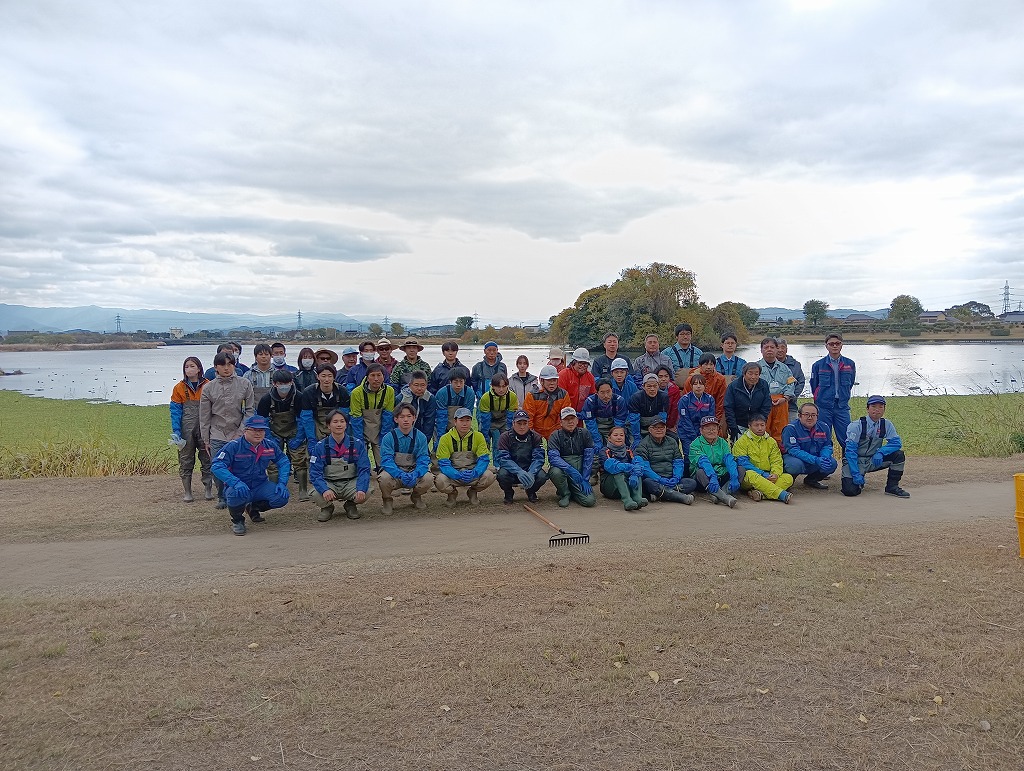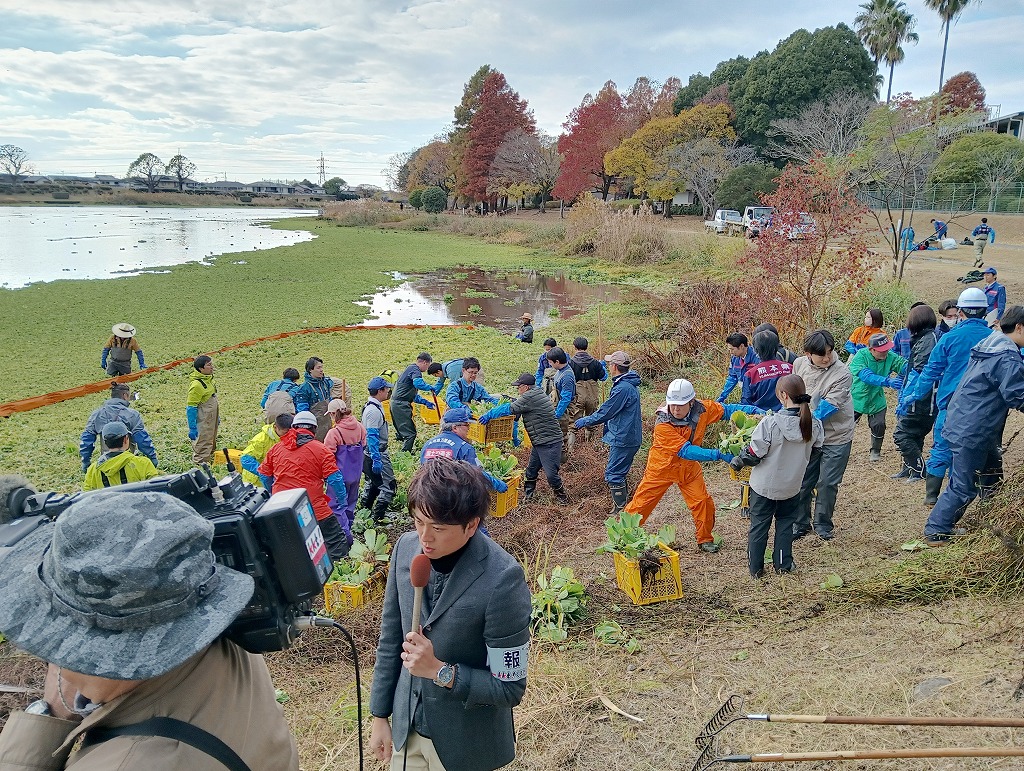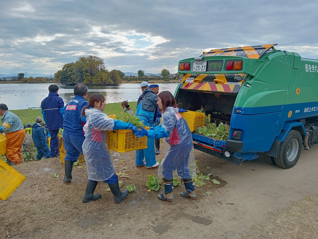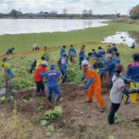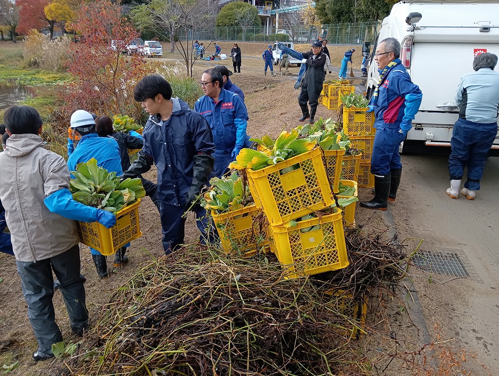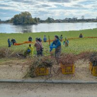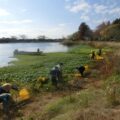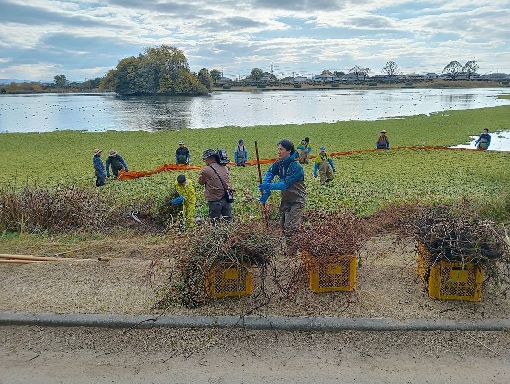 外来水草は繁殖力が強く、環境や治水、利水、漁業などに悪影響をもたらすため、加勢川に流出する前に除去を行い、加勢川の環境保全及び下流域の漁業への影響を低減することを目的としています。たくさんの外来水草が繁茂する中、皆さんカッパや胴長をはいてどんどん作業されていました。約2時間ほどの作業で、湖岸に溜まっていた外来水草をかなり減らせることができました。参加された皆様、お疲れさまでした。