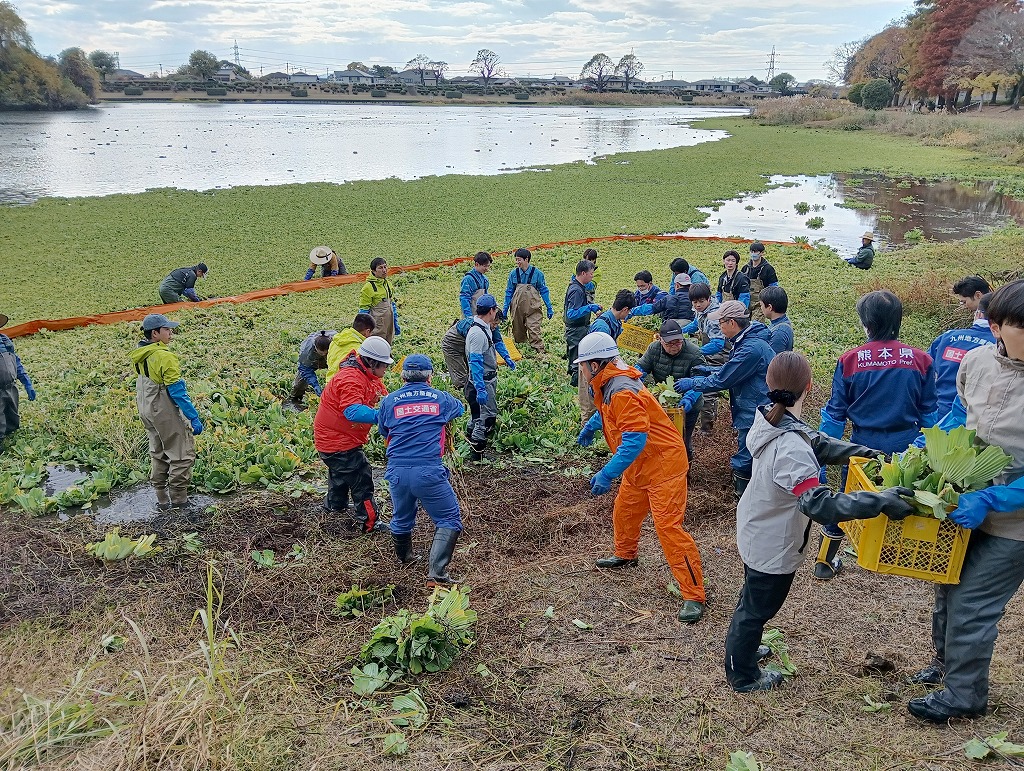 今日、緑川水系水草対策連絡協議会の皆様が外来水草除去のボランティア活動を実施されました。主に江津湖に繁茂しているボタンウキクサ(ウォーターレタス)やナガエツルノゲイトウの除去です。
