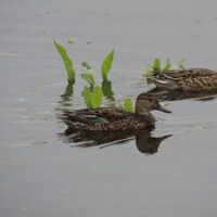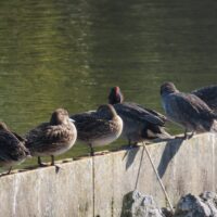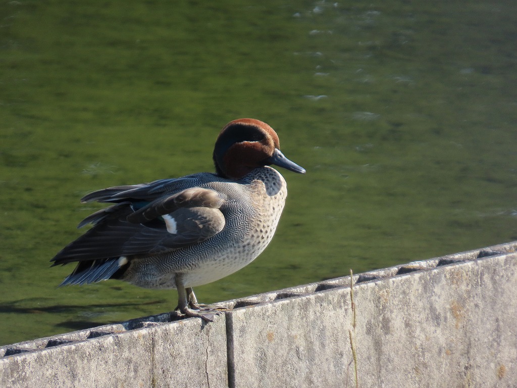 コガモのオスは、目のまわりが緑色をしていてとてもきれいですが、今の時期きれいな色をしている個体は少ないようです。メスは地味な体色をしています。江津湖では比較的浅い岸部付近でよく見かけます。毎日同じ場所で見かけますので、お気に入りの場所などあるのかもしれません。ゆっくり休んでいる個体も多いので、じっくり観察できると思います。