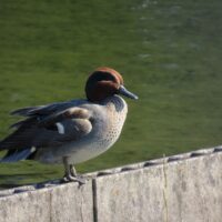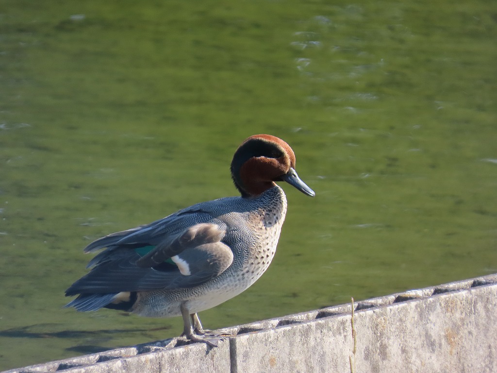 園内でコガモをよく見かけるようになりました。名前の通り、他のカモより一回り小さいカモです。